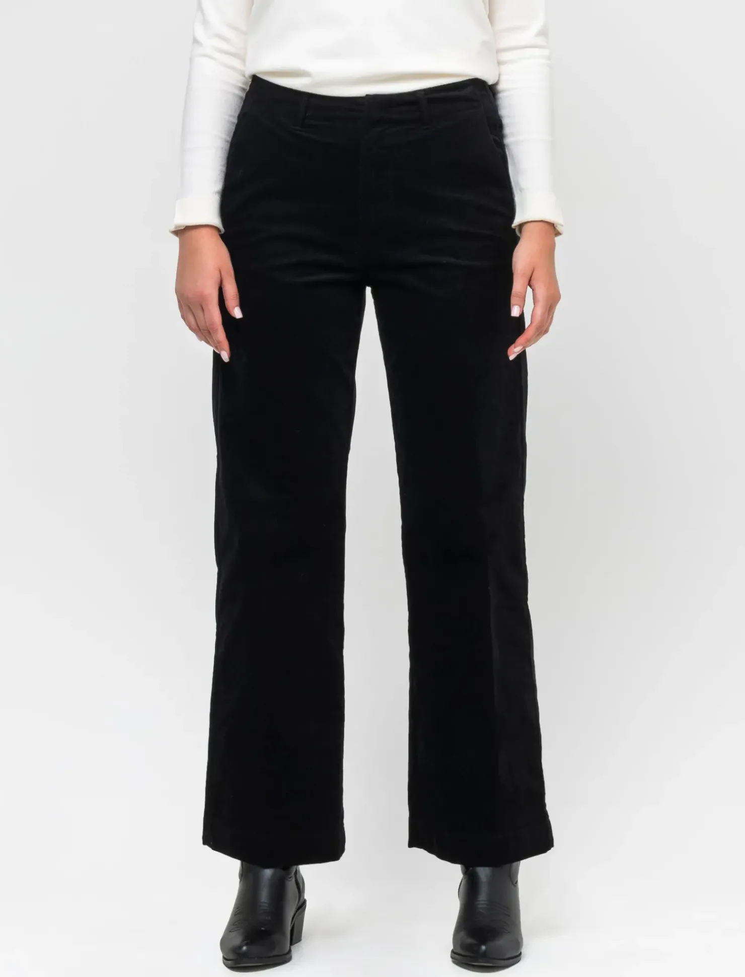 Pantalone in velluto gamba larga, pensato per la donna moderna che ama unire comfort e stile. Questo modello presenta un elastico in vita che garantisce una vestibilità perfetta, mentre la chiusura con zip e gancio nascosto conferisce un tocco di eleganza. Le tasche a filetto posteriori aggiungono praticità senza compromettere l’estetica. Il prodotto è di colore Nero