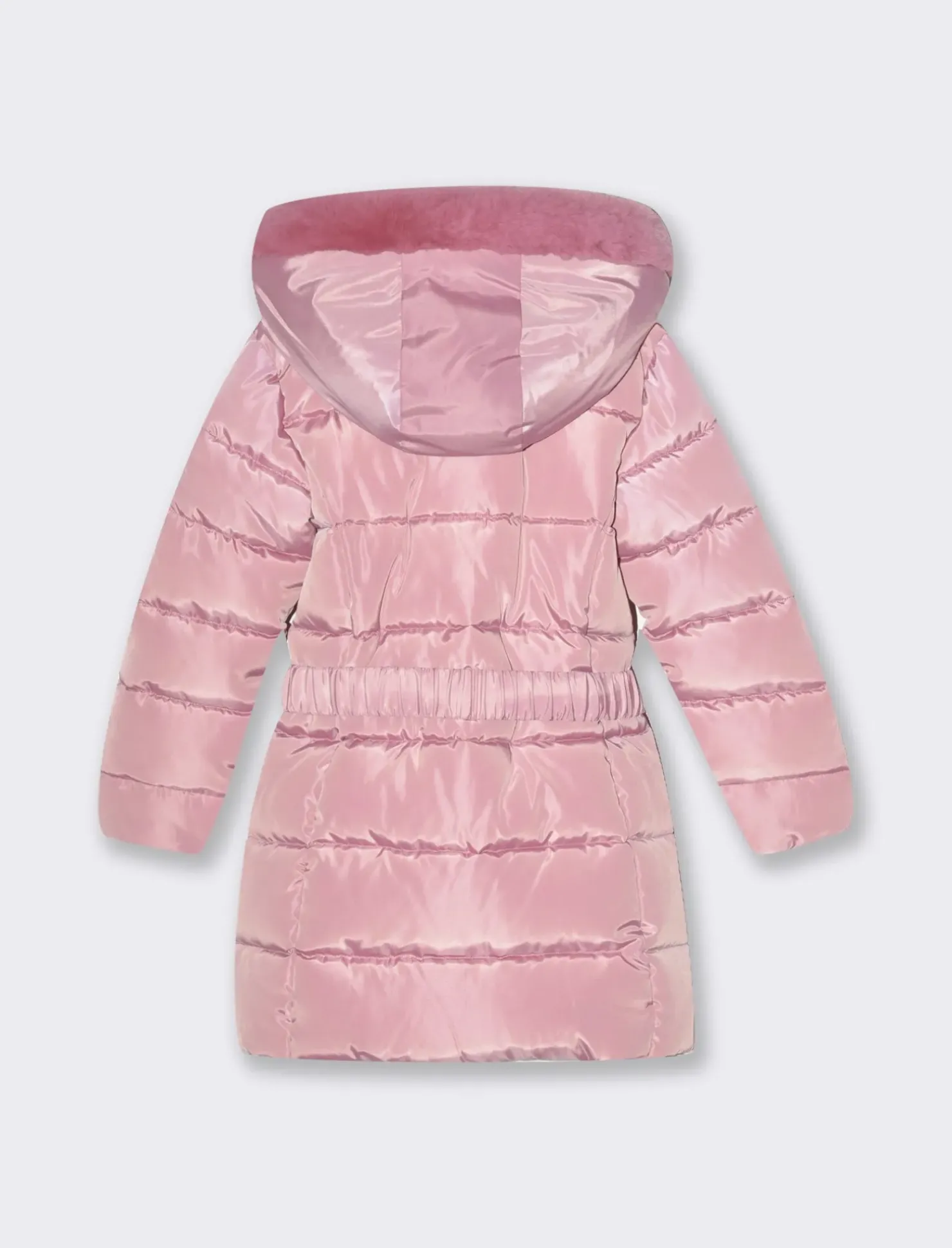 Piumino da bambina con cuciture orizzontali, cintura cucita in vita con fibbia decorativa a scatto e cappuccio con pelo sintetico. Tasche laterali Il prodotto è di colore Viola malva
