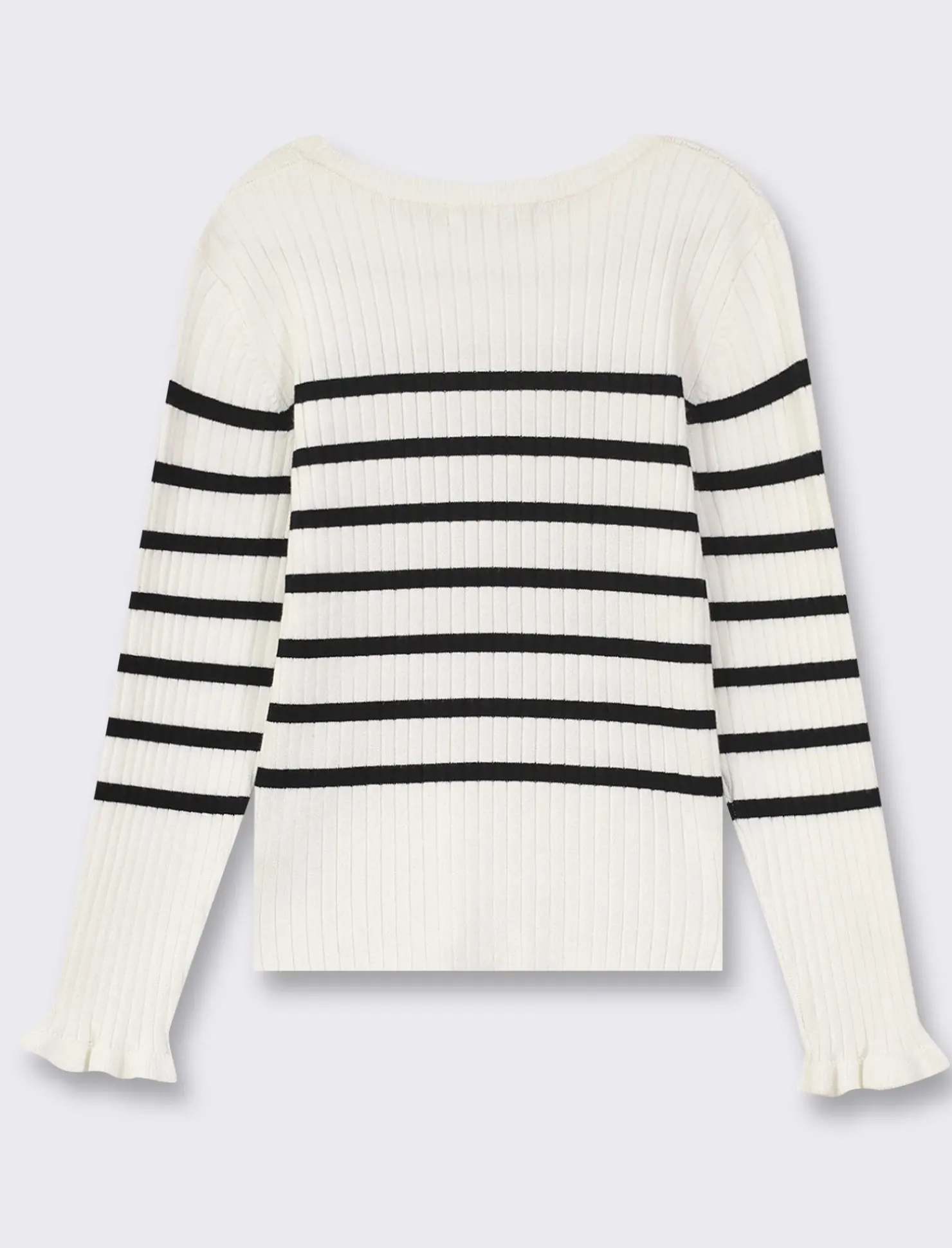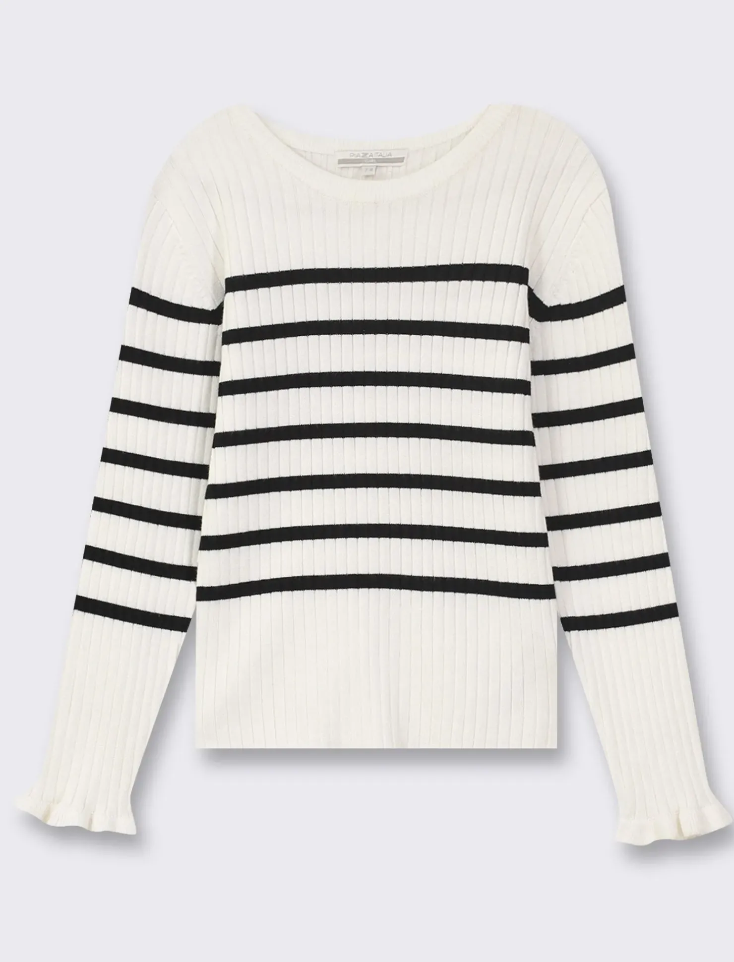 Pullover in maglia sottile rigata, realizzato con una mano morbida e avvolgente. Il design presenta un orlo ondulato che arricchisce il fondo manica, conferendo un tocco di eleganza e originalità. La vestibilità regolare lo rende versatile, adattandosi perfettamente a diverse silhouette e occasioni. Ideale per un look casual chic, questo pullover è perfetto da abbinare a jeans o gonne, per un outfit sempre alla moda e confortevole. Il prodotto è di colore Righe