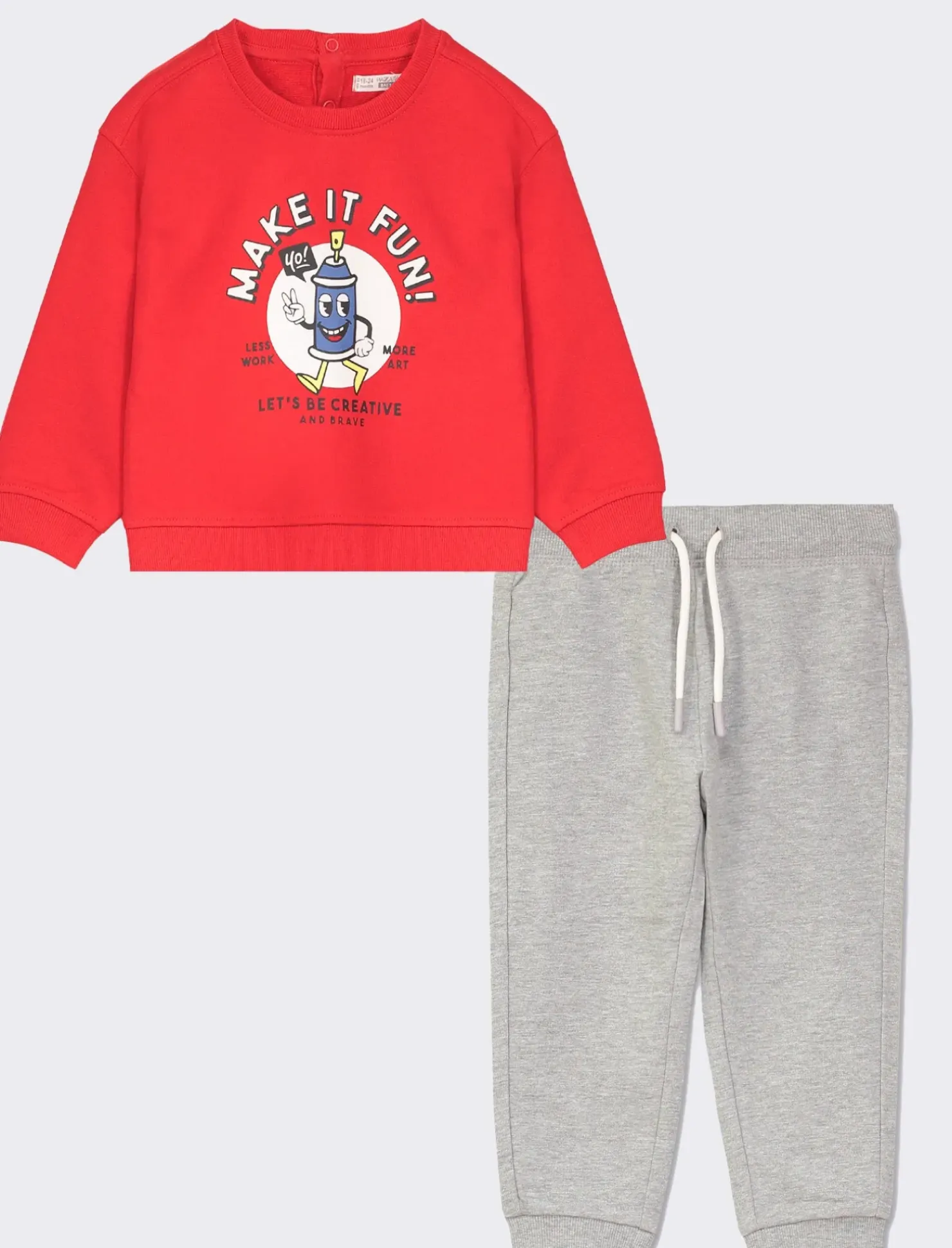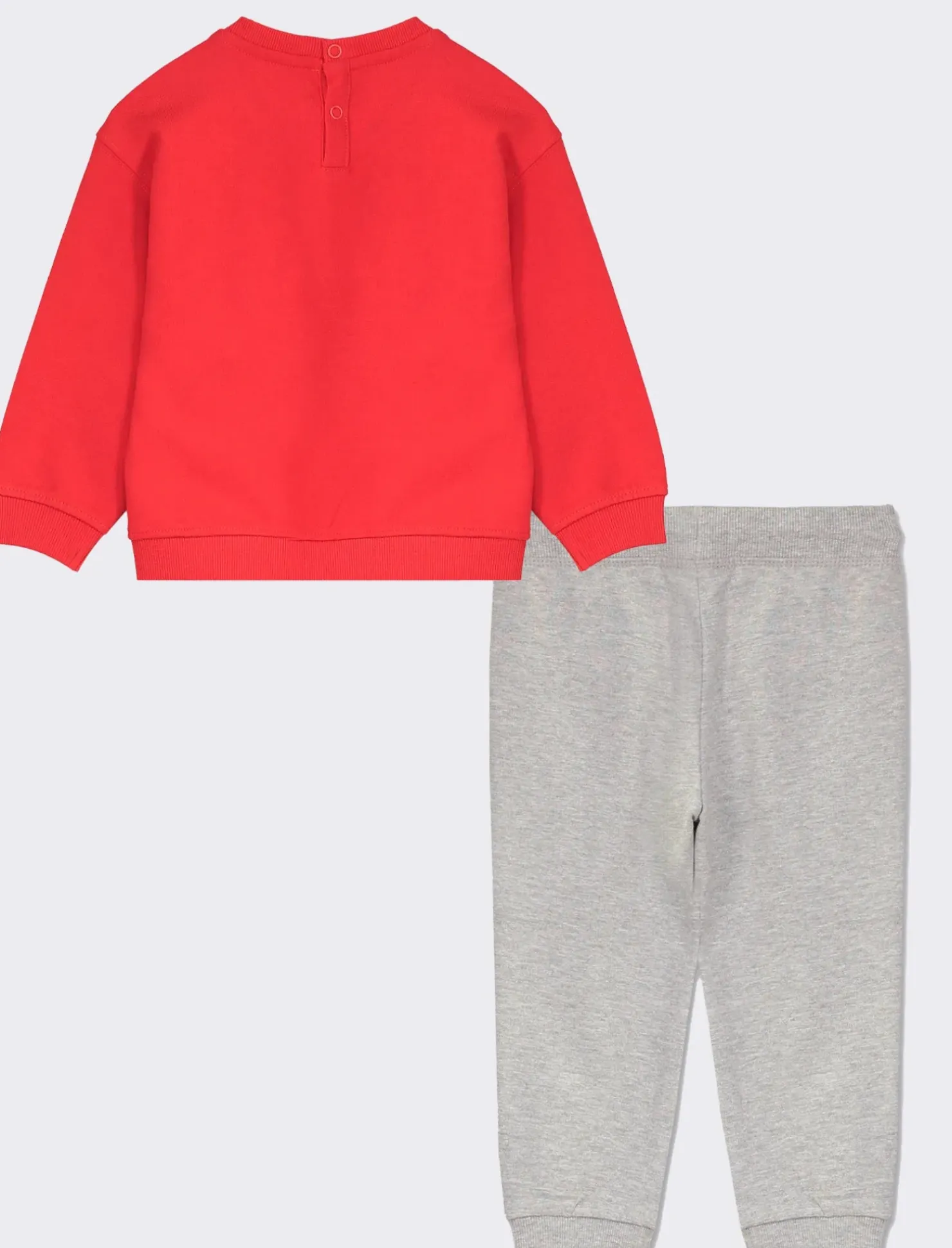 Tuta sportiva per bambini composta da felpa e pantaloni jogger. La felpa presenta una stampa frontale divertente, mentre i jogger sono in tinta unita. Disponibile in tre diverse varianti di colore, ideale per un look casual e comodo per i più piccoli. Il prodotto è di colore Rosso