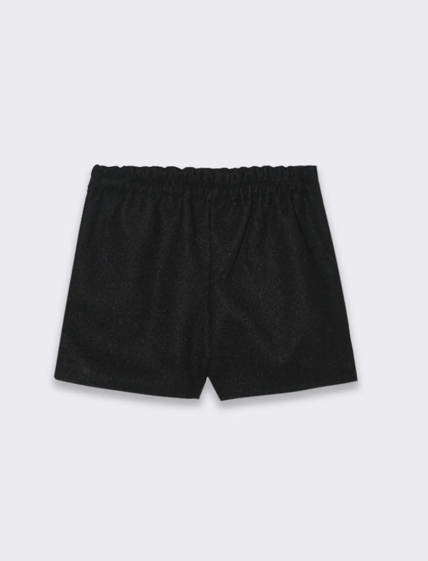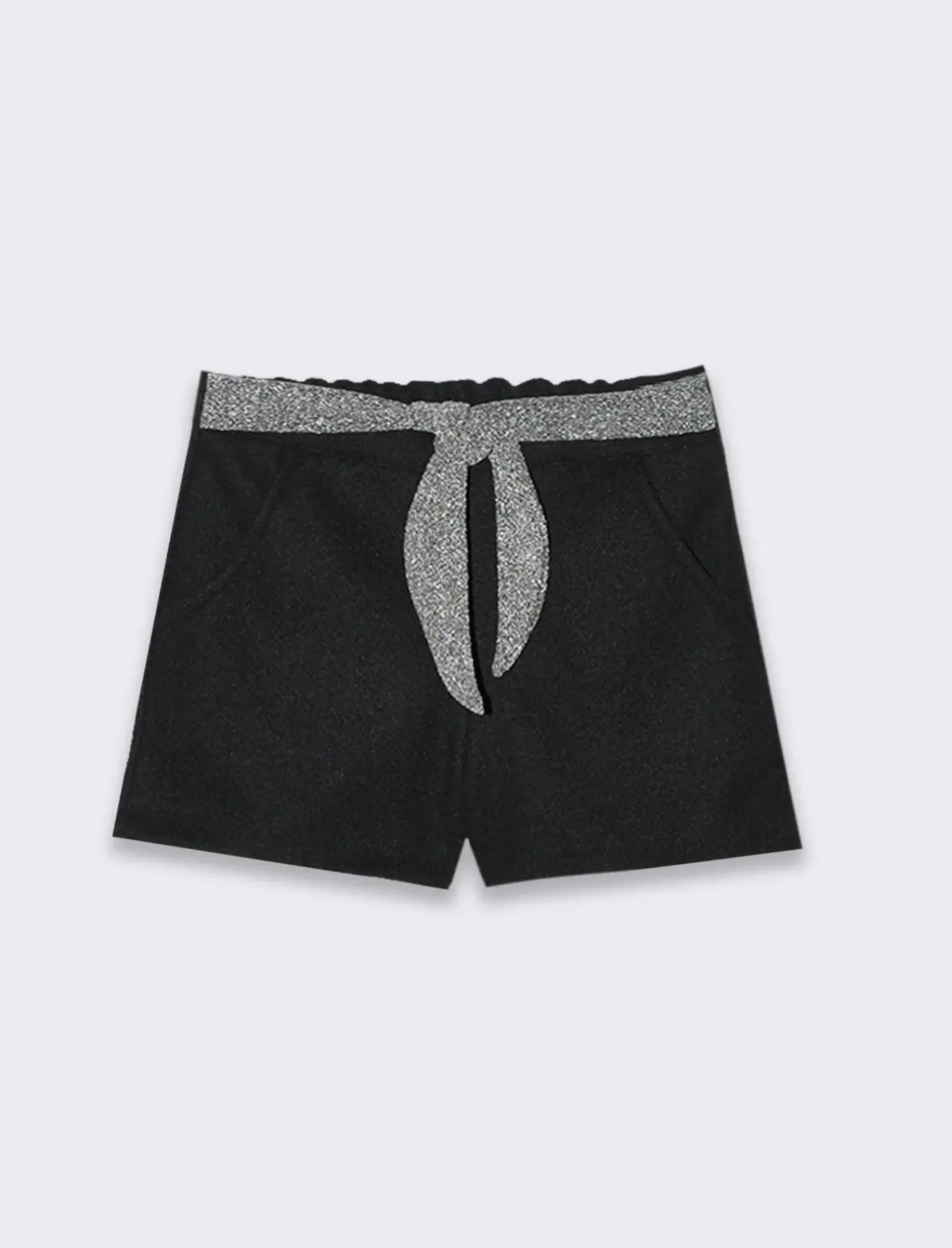 Elegante pantaloncino in tessuto di panno, con cintura argentata in tessuto brillante e tasche frontali,perfetto da indossare nelle serate più chic Il prodotto è di colore Nero
