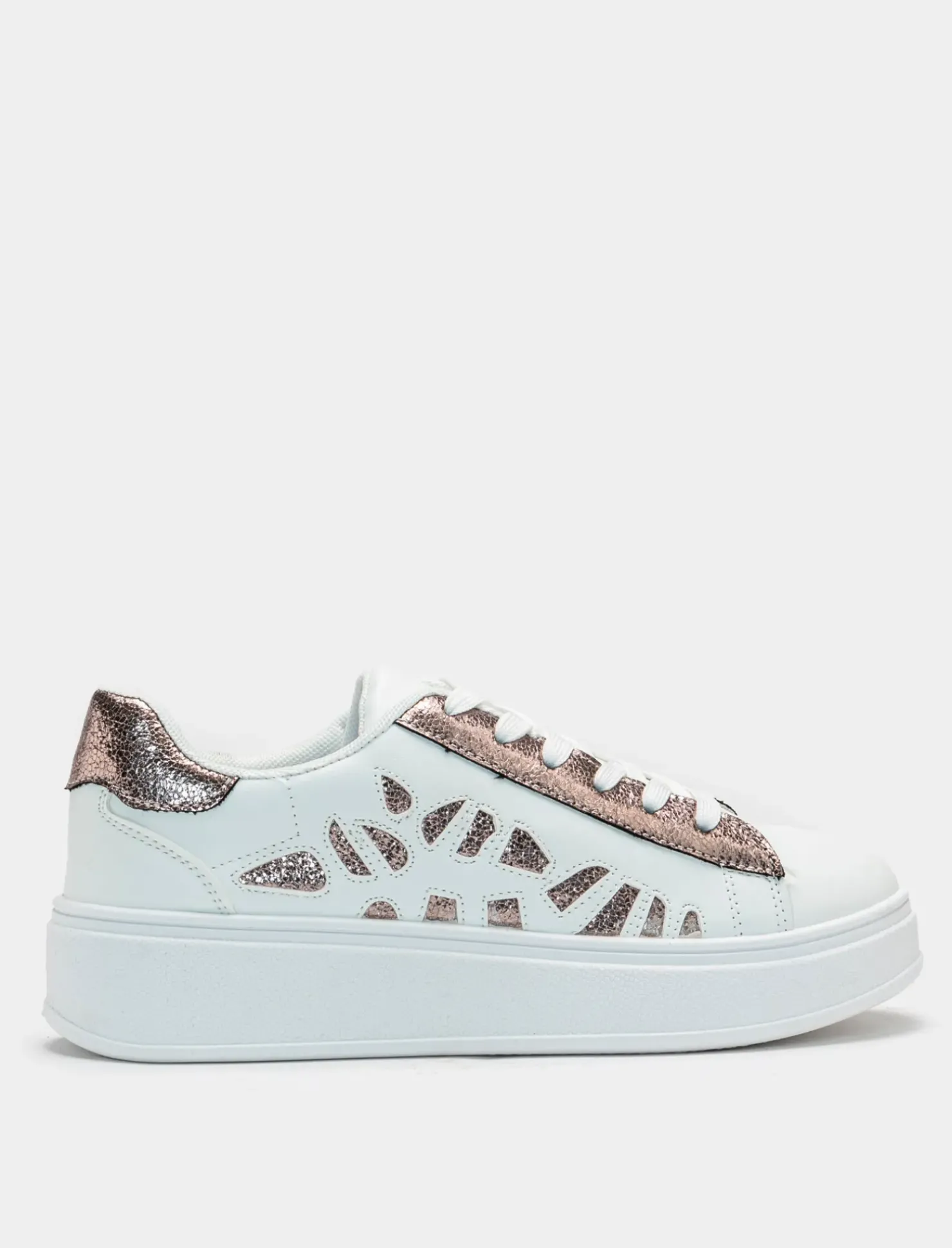 Sneakers in poliuretano bianco con intarsi color bronzo. Ideali per un look casual ma ricercato, perfette per completare il tuo outfit in modo originale e trendy. La combinazione di colori neutri e dettagli metallici le rende versatili e adatte a diverse occasioni. Il prodotto è di colore Bianco