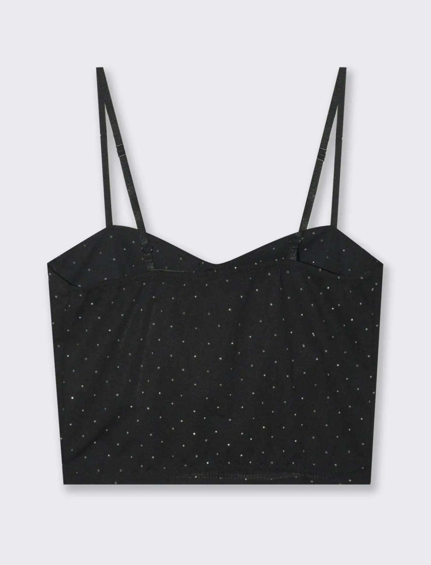 TOP SCOLLO A CUORE CON BRETELLINE E STRASS APPLICATI Il prodotto è di colore Nero