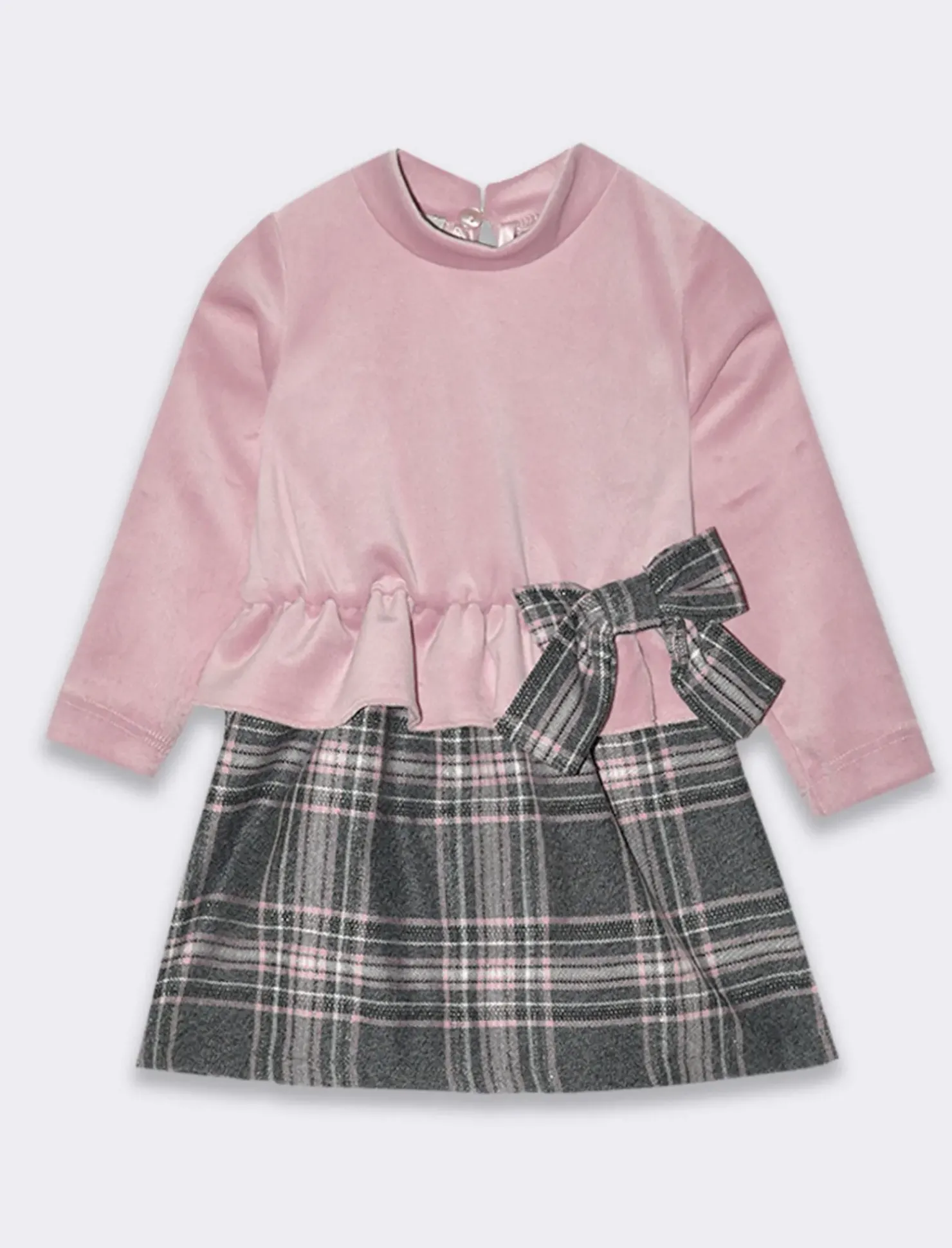 Abito combinato in ciniglia e tessuto scozzese. Fiocco laterale applicato. Vita elastica e abbottonatura a goccia sul dietro.Morbido e soffice al tatto renderà il look della tua bambina glamour senza rinunciare al comfort. Il prodotto è di colore Fantasia