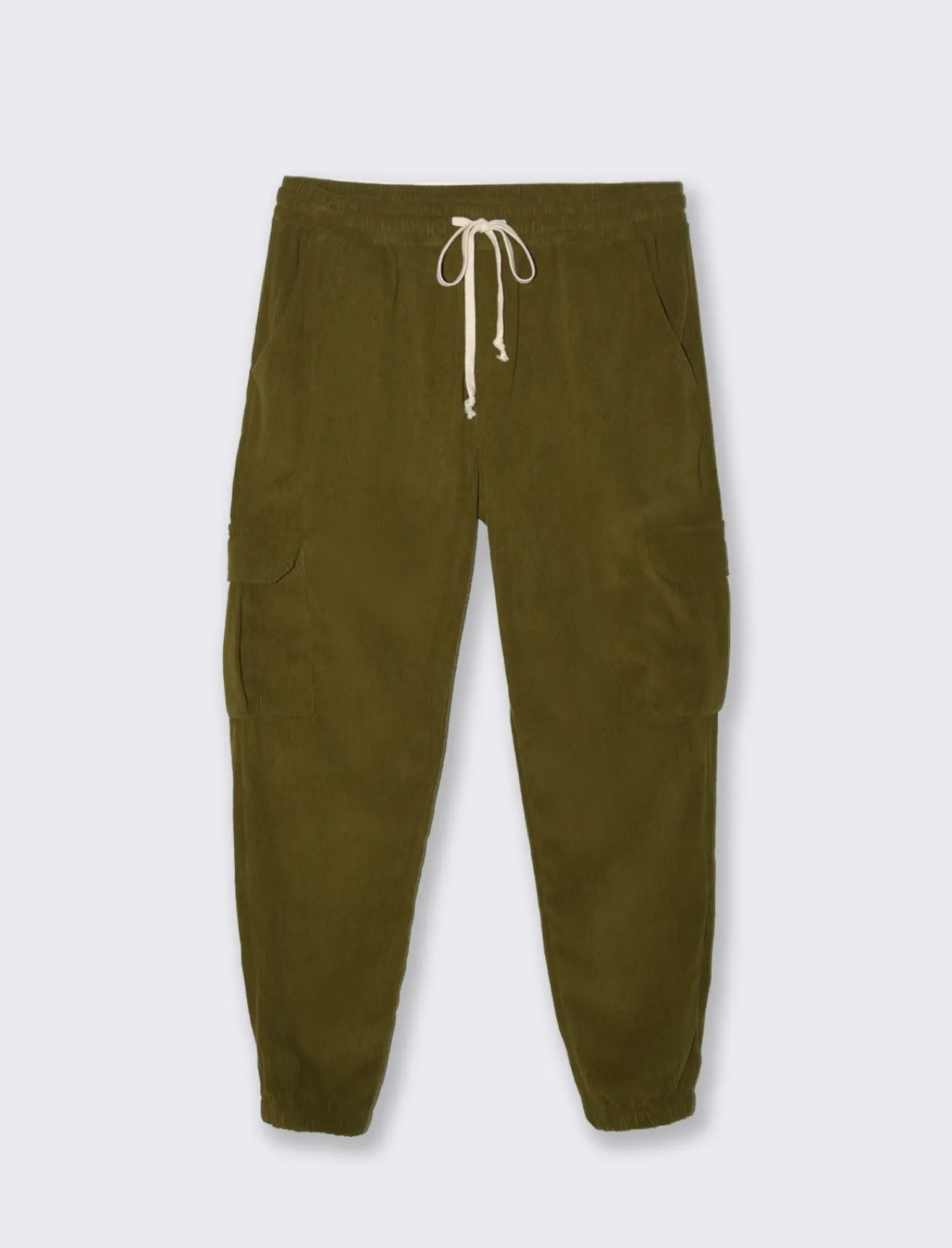 Pantaloni Cargo Jogger in velluto a coste, tapered fit. Tasche anteriori chino e dettaglio di tasca a toppa posteriore. Tasche laterali con patta. Vita elasticizzata regolabile con laccio. Elastici al fondo. Il prodotto è di colore Ve.milit.