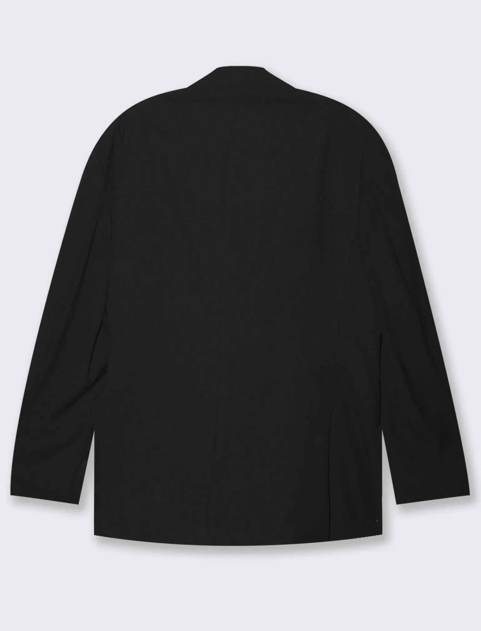 Blazer doppio petto in tessuto strutturato, caratterizzato da un elegante formal fit che si adatta perfettamente alla silhouette maschile. Il rever classico conferisce un tocco di raffinatezza, mentre le maniche lunghe, arricchite da un dettaglio di bottoni sui polsini, aggiungono un elemento distintivo. Le pratiche tasche a filetto sui fianchi e la tasca interna offrono funzionalità senza compromettere lo stile, rendendolo ideale per occasioni formali. Il prodotto è di colore Nero