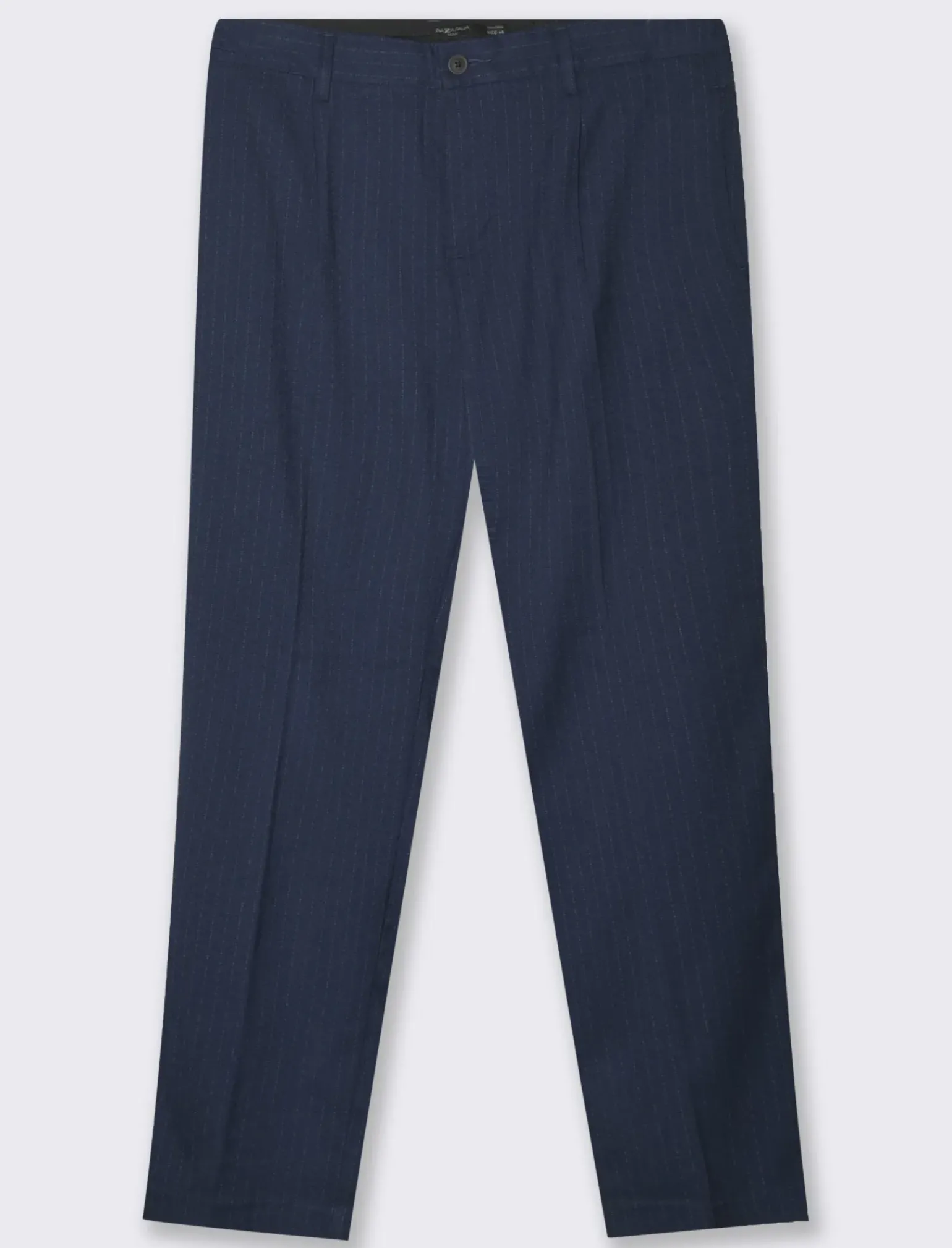 Pantaloni Chino a righe wide fit, perfetti per un look casual ma curato. Con tasche anteriori e dettaglio di tasche a filetto sul retro, sono comodi e versatili. Le pinces sul davanti aggiungono un tocco di stile in più. Ideali per un uomo che ama essere alla moda senza rinunciare al comfort. Il prodotto è di colore Blu