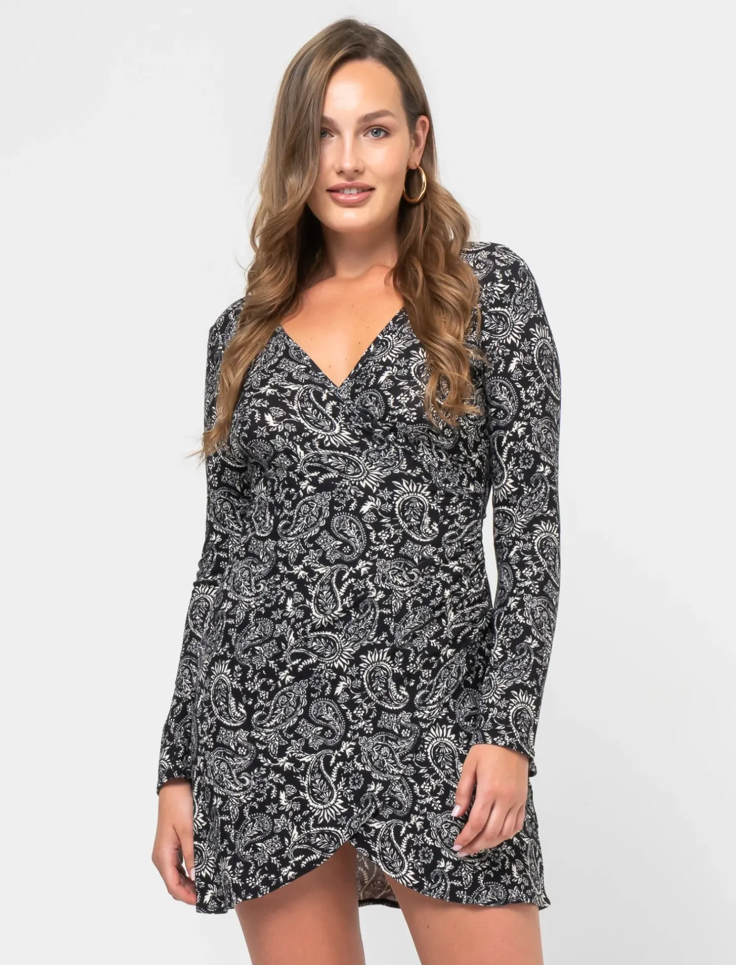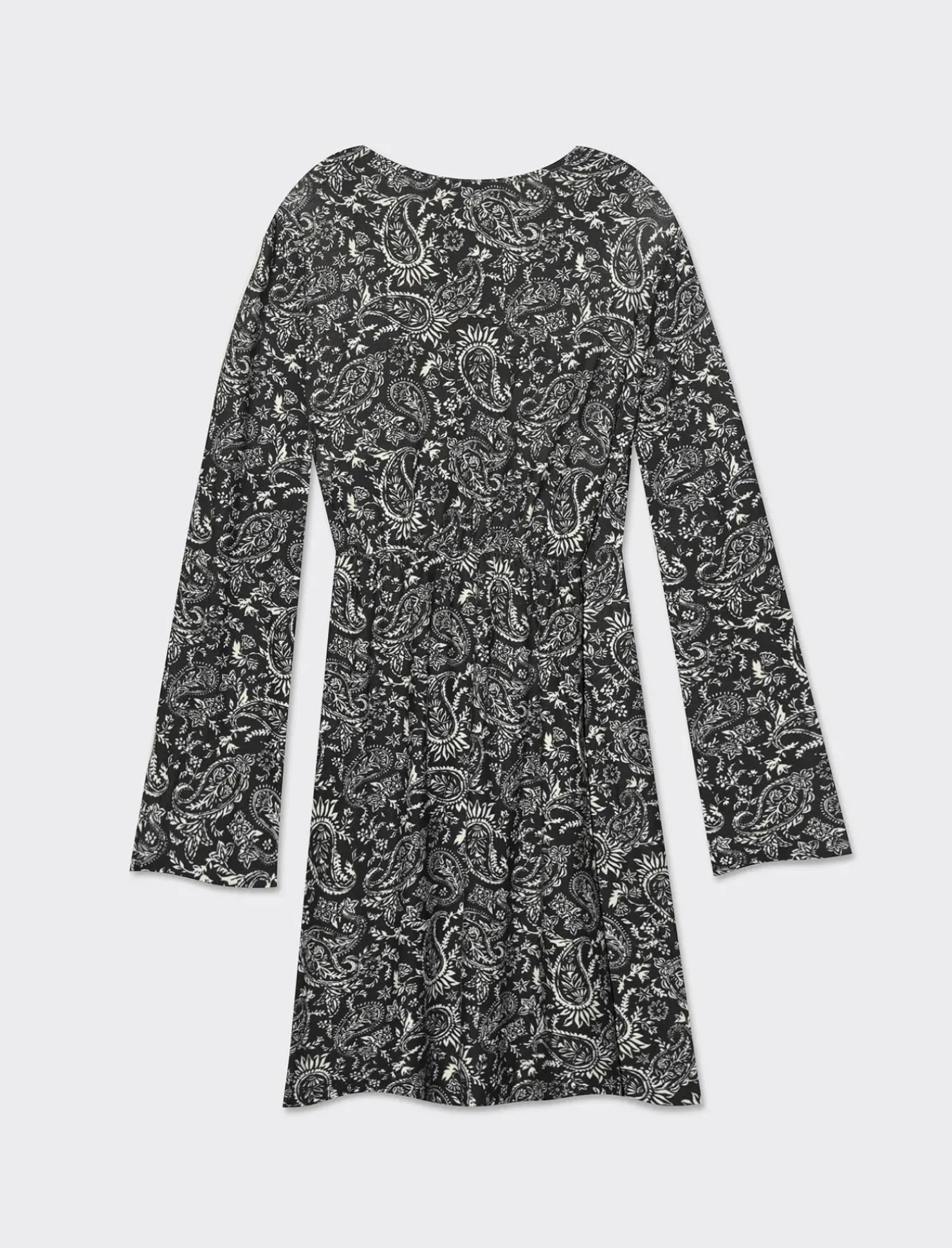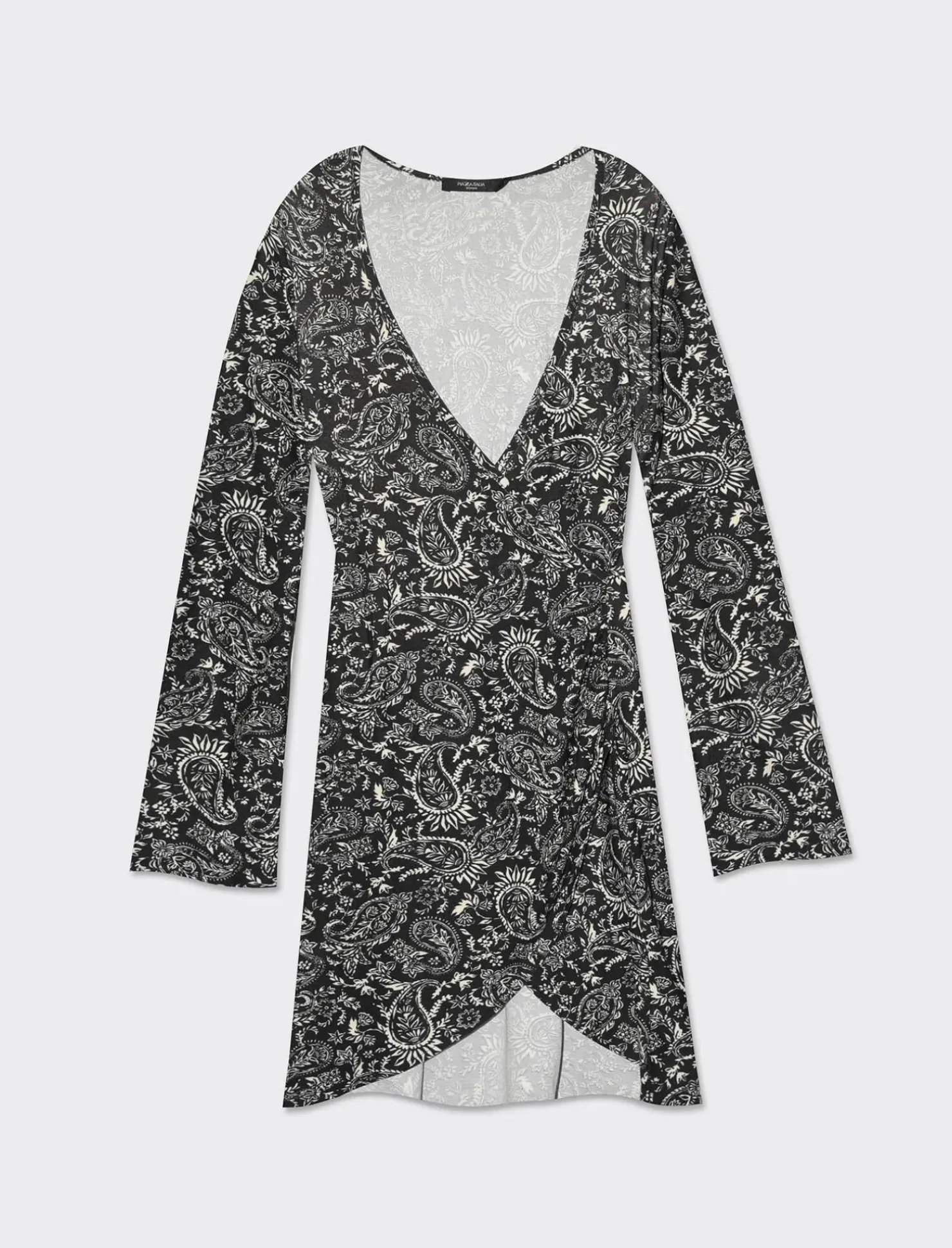 Vestito corto stampato per donna con un elegante pannello drappeggiato sul davanti e un comodo elastico sul retro. Le maniche lunghe aggiungono un tocco di classe e versatilità a questo capo, perfetto per un look casual ma sofisticato. Il prodotto è di colore var 3
