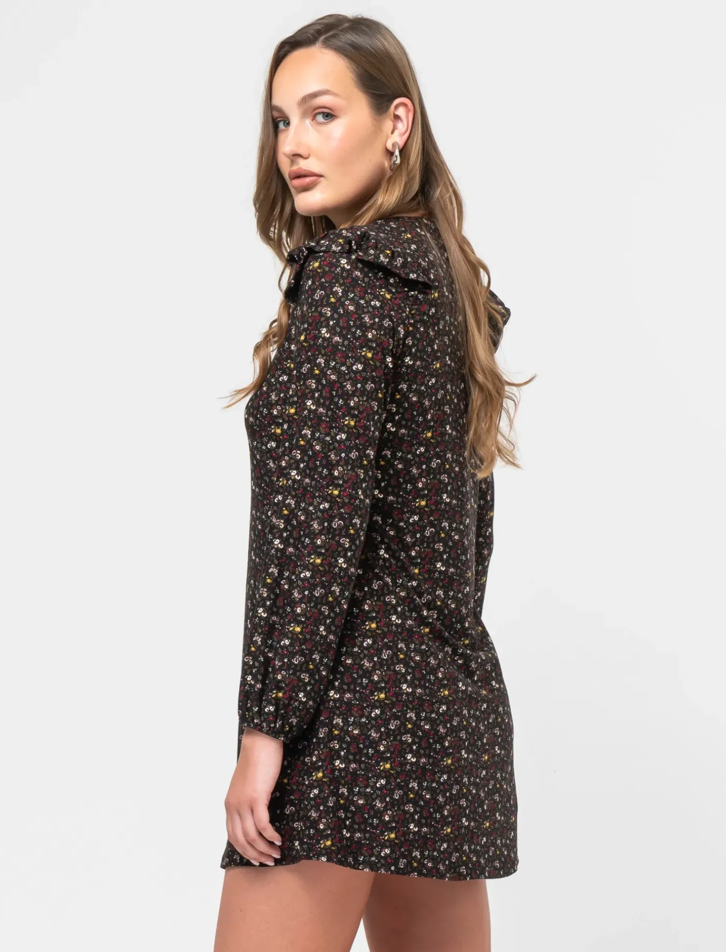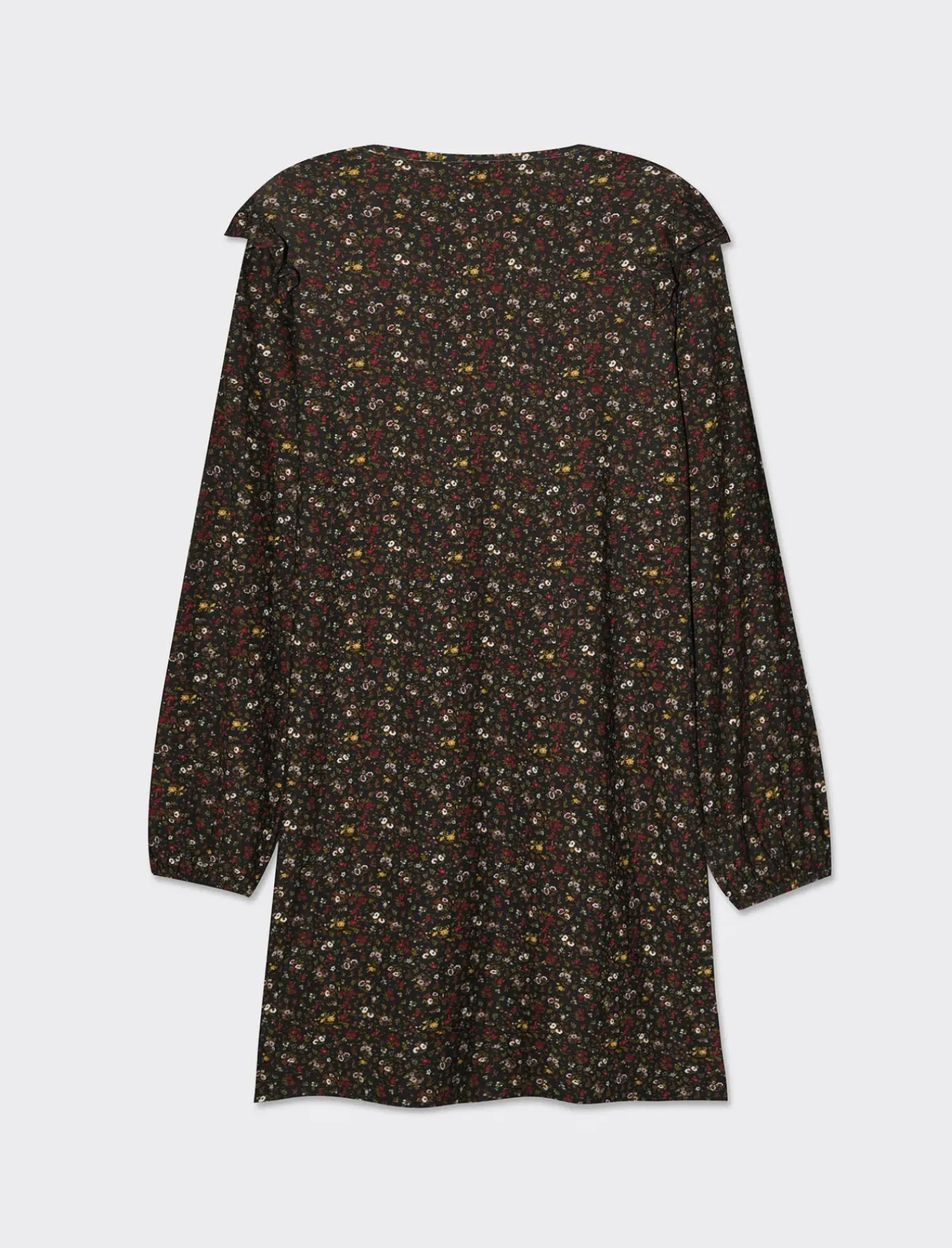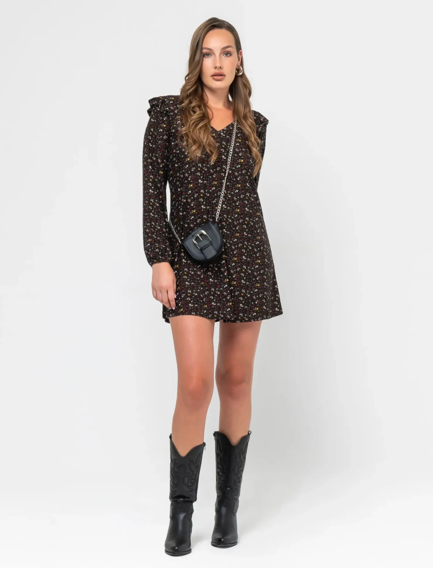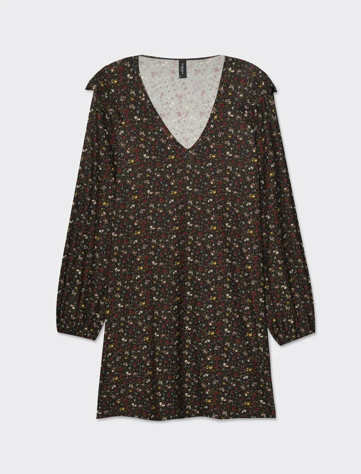 Vestito corto stampato con scollo a V, perfetto per valorizzare la silhouette femminile. La manica lunga e il volant sulla spalla aggiungono un tocco di eleganza e femminilità. Il taglio dritto dona un look moderno e sofisticato, ideale per un’occasione speciale o una serata fuori. Il prodotto è di colore var 1