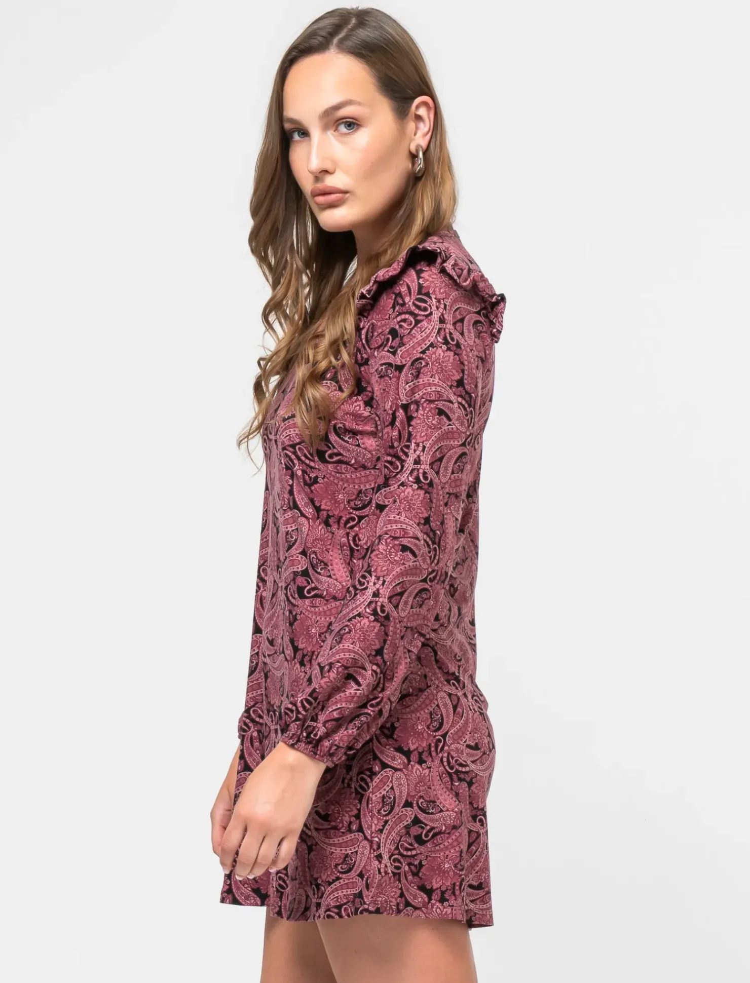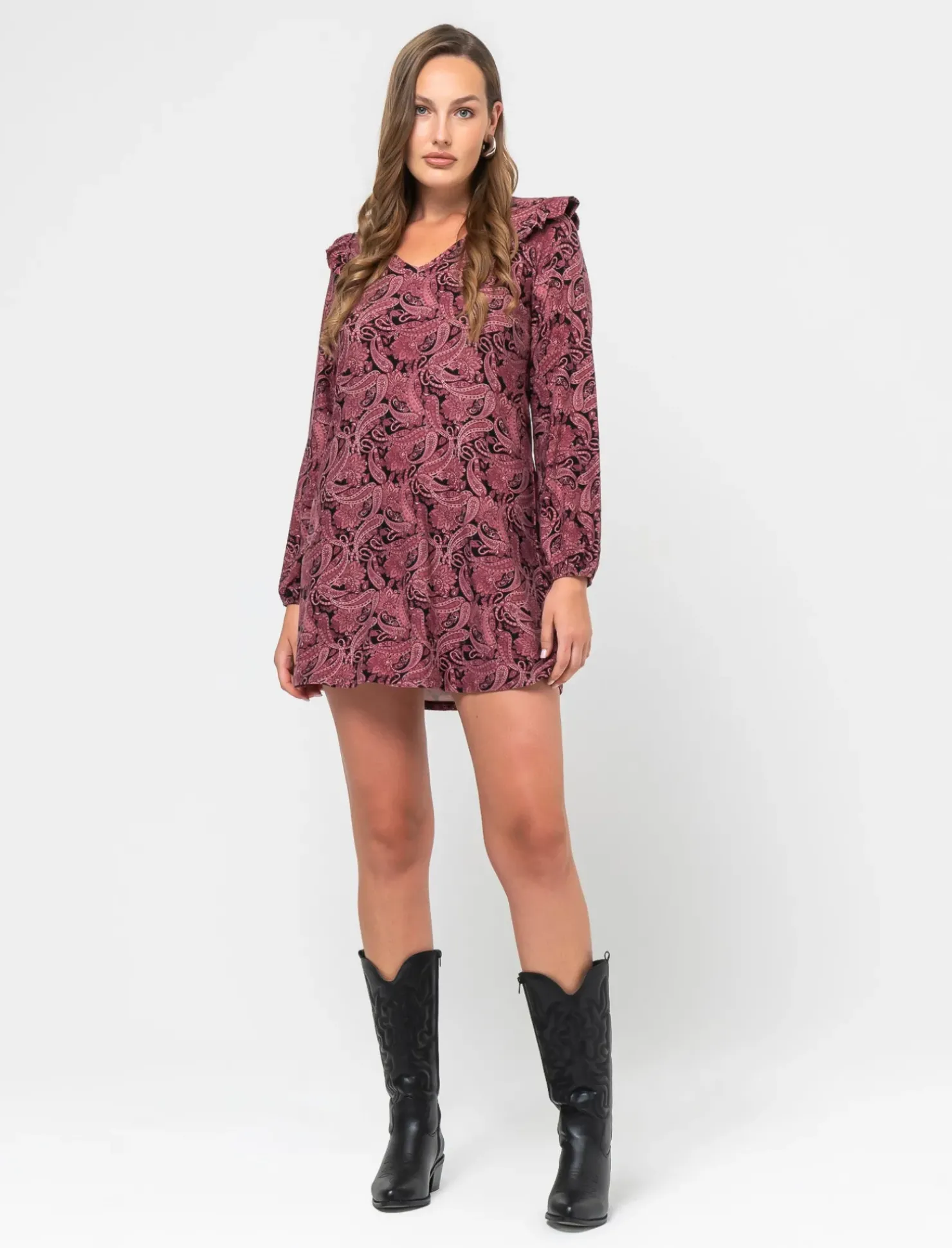 Vestito corto stampato con scollo a V, perfetto per valorizzare la silhouette femminile. La manica lunga e il volant sulla spalla aggiungono un tocco di eleganza e femminilità. Il taglio dritto dona un look moderno e sofisticato, ideale per un’occasione speciale o una serata fuori. Il prodotto è di colore var 2
