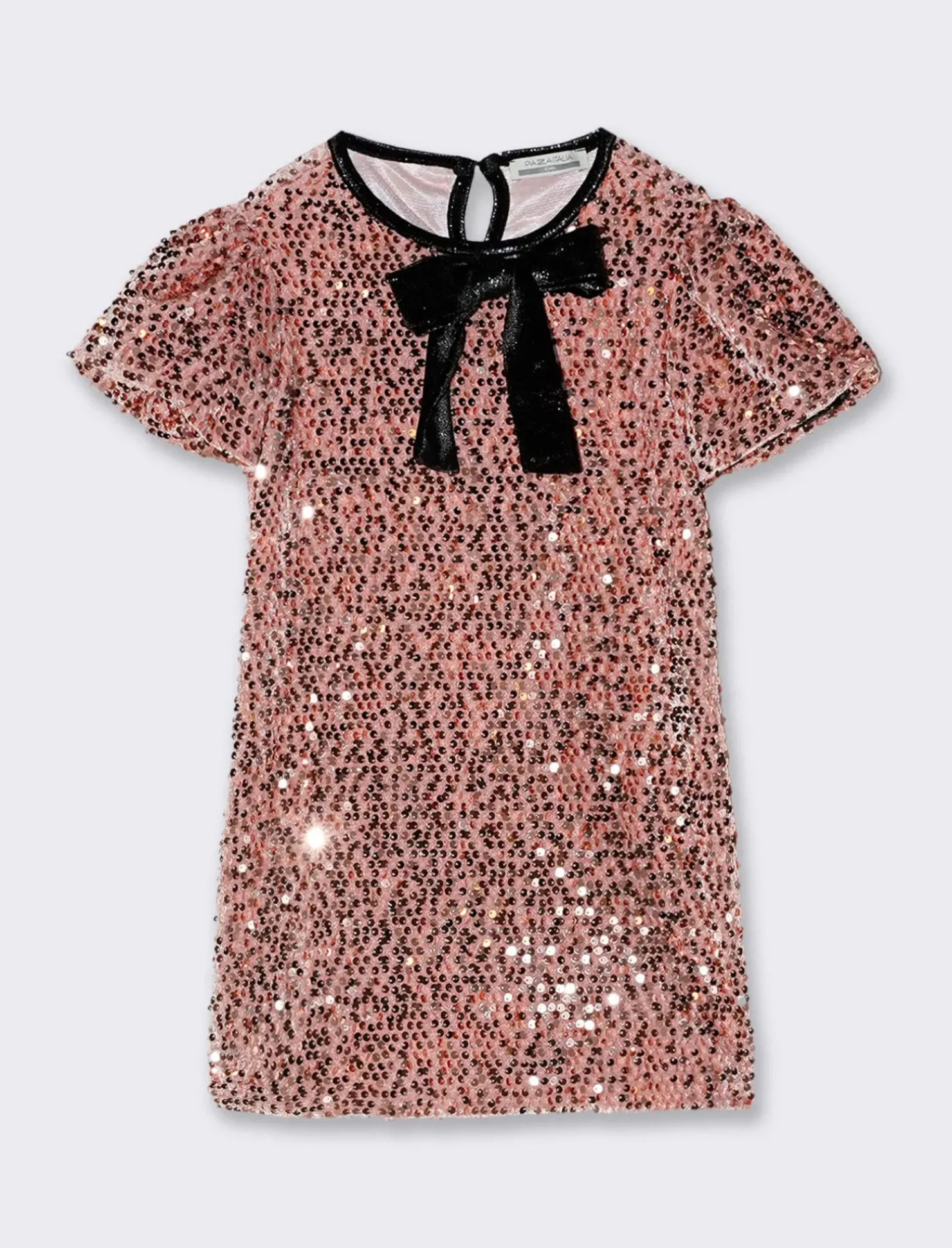 Vestito elegante da bambina in tessuto velour con paillettes. Modello girocollo con manica a palloncino e fondo svasato. Decorato da bordino in contrasto e fiocco allo scollo. Adatto alle festività ed alle occasioni speciali. Il prodotto è di colore Rosa