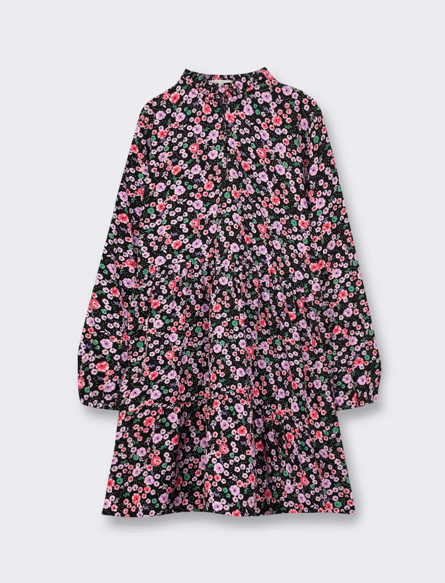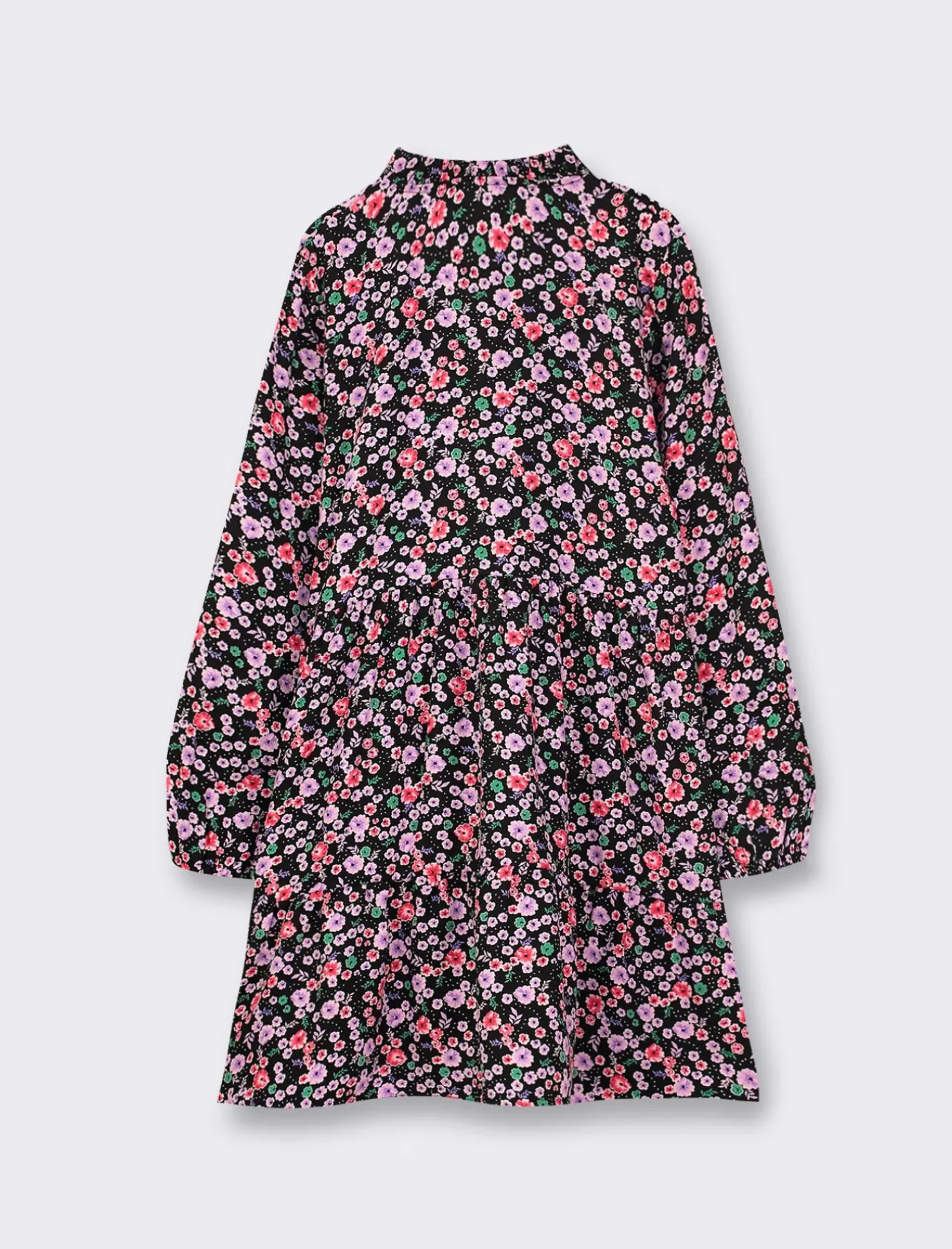 Abito da bambina in viscosa con maniche lunghe e stampa all over. Con apertura sul davanti, rouches sul collo e balze sulla gonna. Un capo comodo e alla moda per le piccole fashioniste di casa. Perfetto per ogni occasione, dal gioco in giardino alle feste di compleanno. Il prodotto è di colore Fantasia