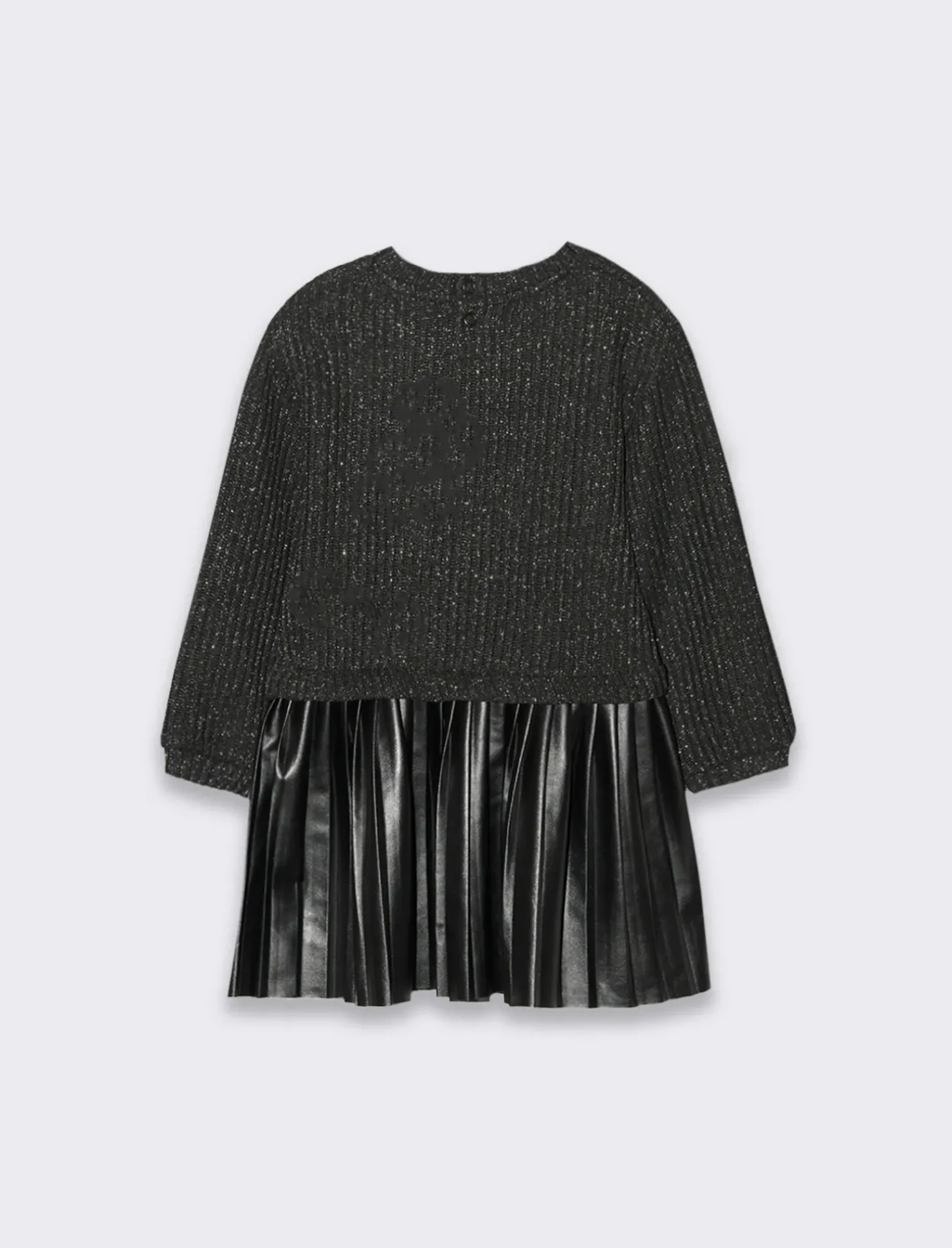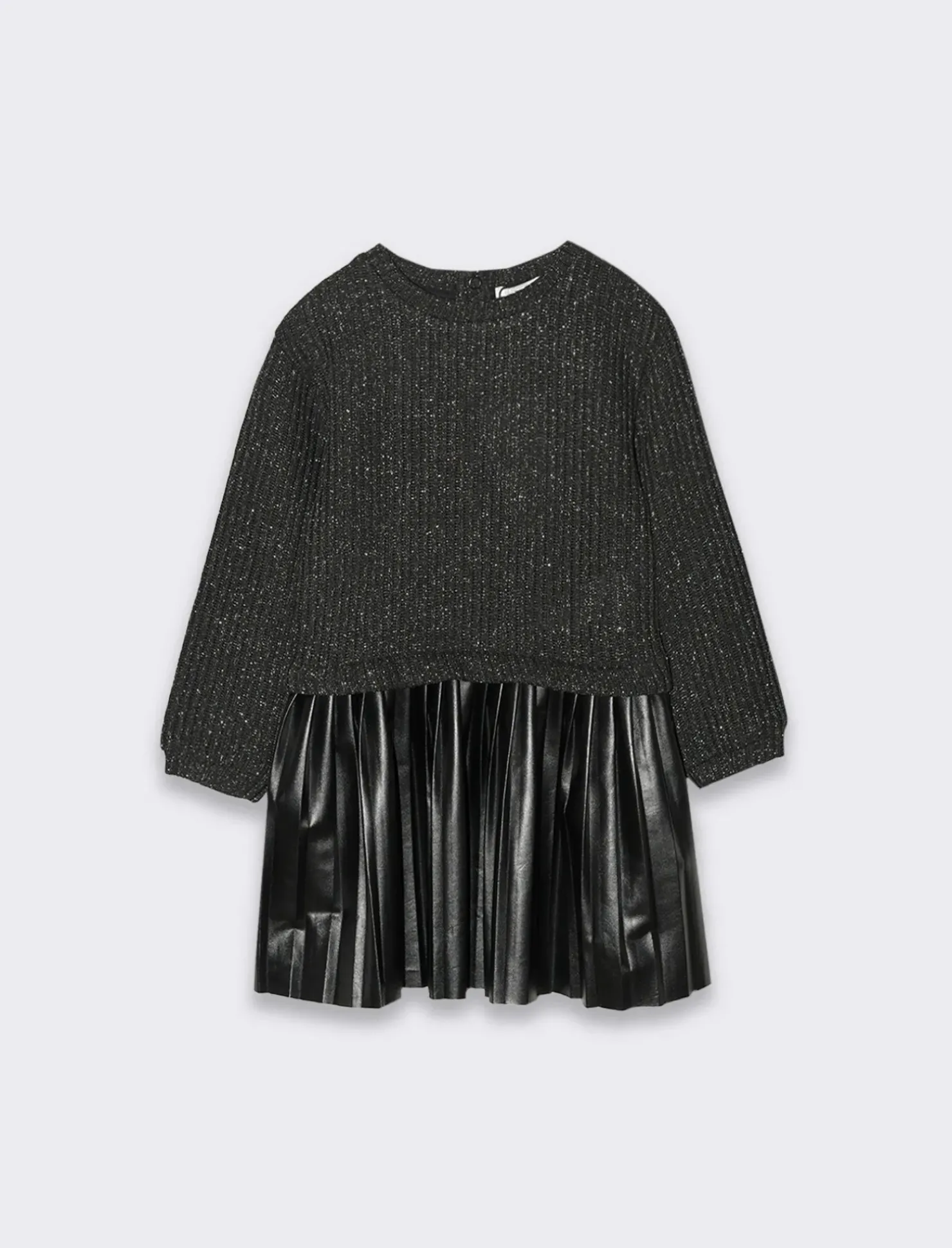 Abito elegante che cattura l’attenzione con il suo tessuto brillante, perfetto per le occasioni speciali. La parte superiore dell’abito è realizzata in un materiale scintillante che riflette la luce, creando un effetto glamour e sofisticato. La parte inferiore, invece, è in finta pelle a pieghe, aggiungendo un tocco moderno e audace al design. Le pieghe donano movimento e struttura, rendendo l’abito ancora più affascinante. Questo capo è ideale per feste ed eventi, permettendoti di brillare e distinguerti con stile.Il presente prodotto è conforme al rischio generico di sicurezza di cui allart.5 del Regolamento Europeo 988/2023. Il prodotto è di colore Nero