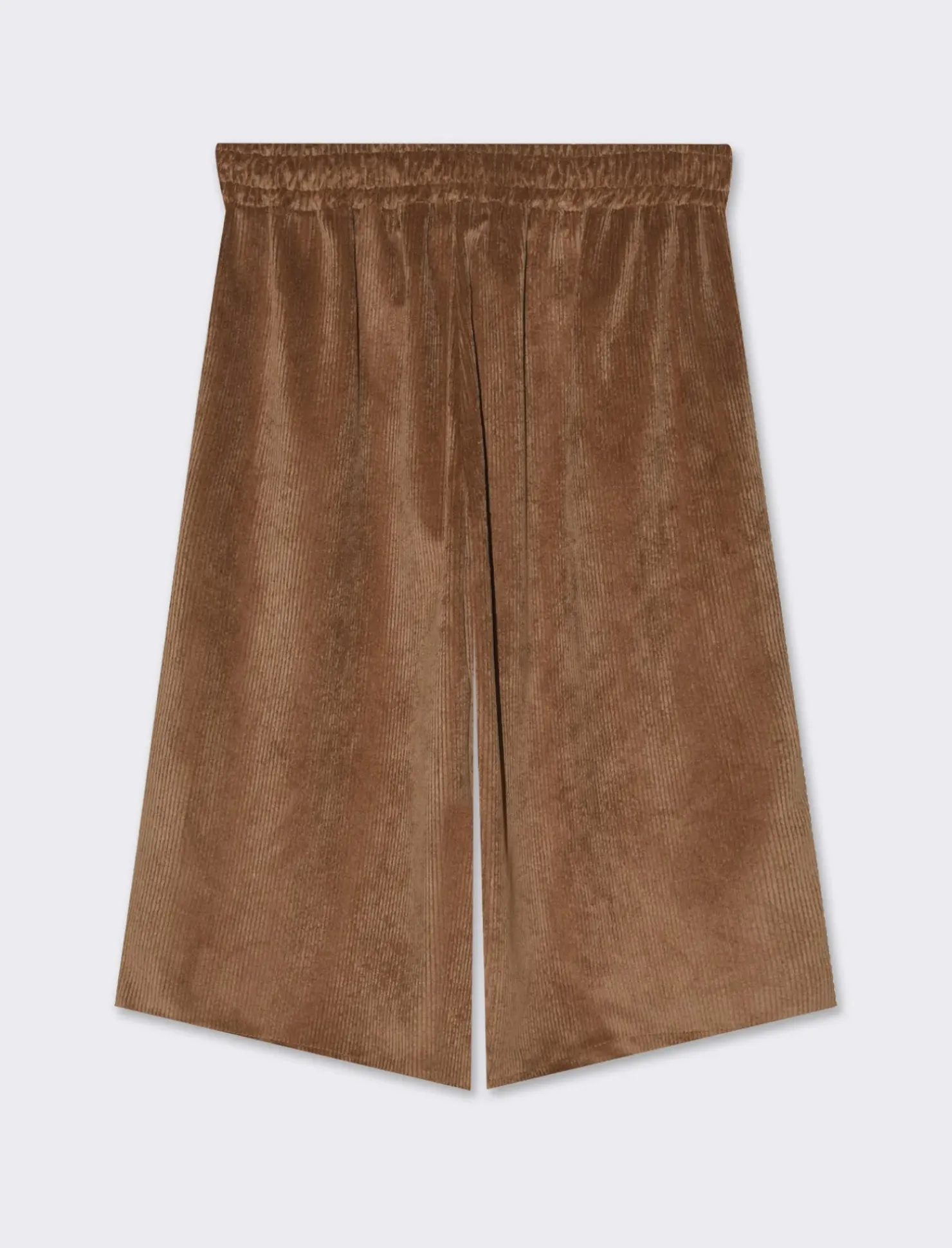 Bermuda over in velluto a coste, un capo che unisce comfort e stile con un tocco retrò. Il velluto a coste, con la sua texture ricca e materica, dona ai bermuda un aspetto sofisticato e caldo, perfetto per le stagioni più fresche. Questi bermuda presentano una vestibilità ampia e rilassata, che garantisce libertà di movimento e un look casual-chic. Le tasche laterali sono ampie e funzionali, perfetti da abbinare a un maglione oversize e stivali per un look autunnale, oppure a una camicia e mocassini per un outfit più elegante. Il prodotto è di colore Marrone tabacco
