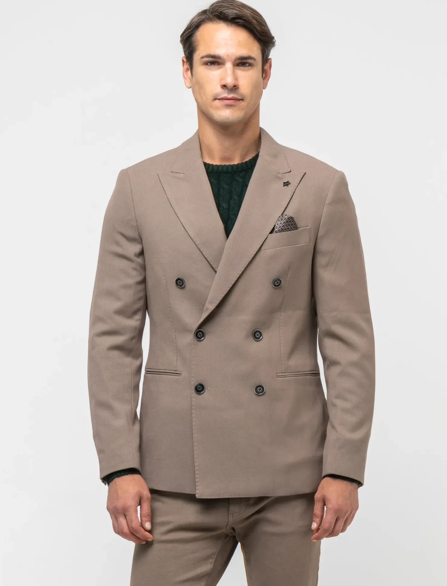 Blazer doppio petto in tessuto strutturato, caratterizzato da un elegante formal fit che si adatta perfettamente alla silhouette maschile. Il rever classico conferisce un tocco di raffinatezza, mentre le maniche lunghe, arricchite da un dettaglio di bottoni sui polsini, aggiungono un elemento distintivo. Le pratiche tasche a filetto sui fianchi e la tasca interna offrono funzionalità senza compromettere lo stile, rendendolo ideale per occasioni formali. Il prodotto è di colore Grigio tortora
