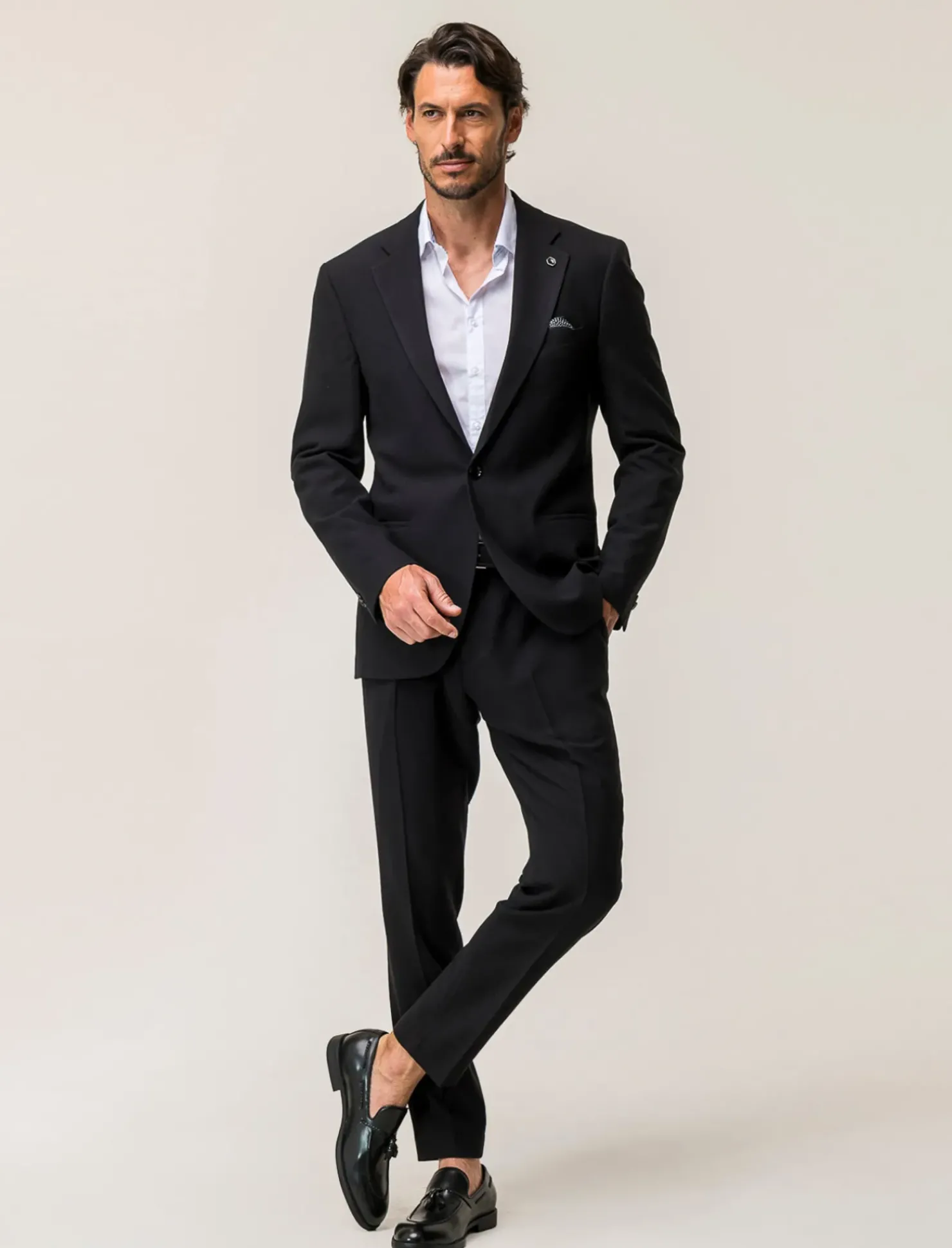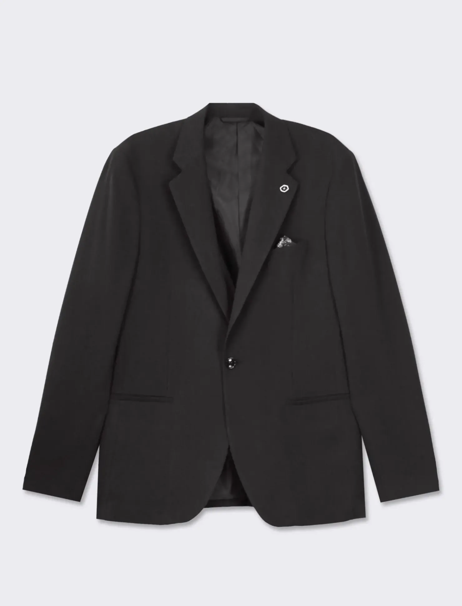 Blazer da completo formal fit per un look elegante e raffinato. Realizzato con tessuto operato di alta qualità, presenta un colletto a revers classici e maniche lunghe con dettaglio di bottoni sul polsino. Dotato di tasca a filetto sul petto e sui fianchi, offre anche una comoda tasca interna. Il prodotto è di colore Nero