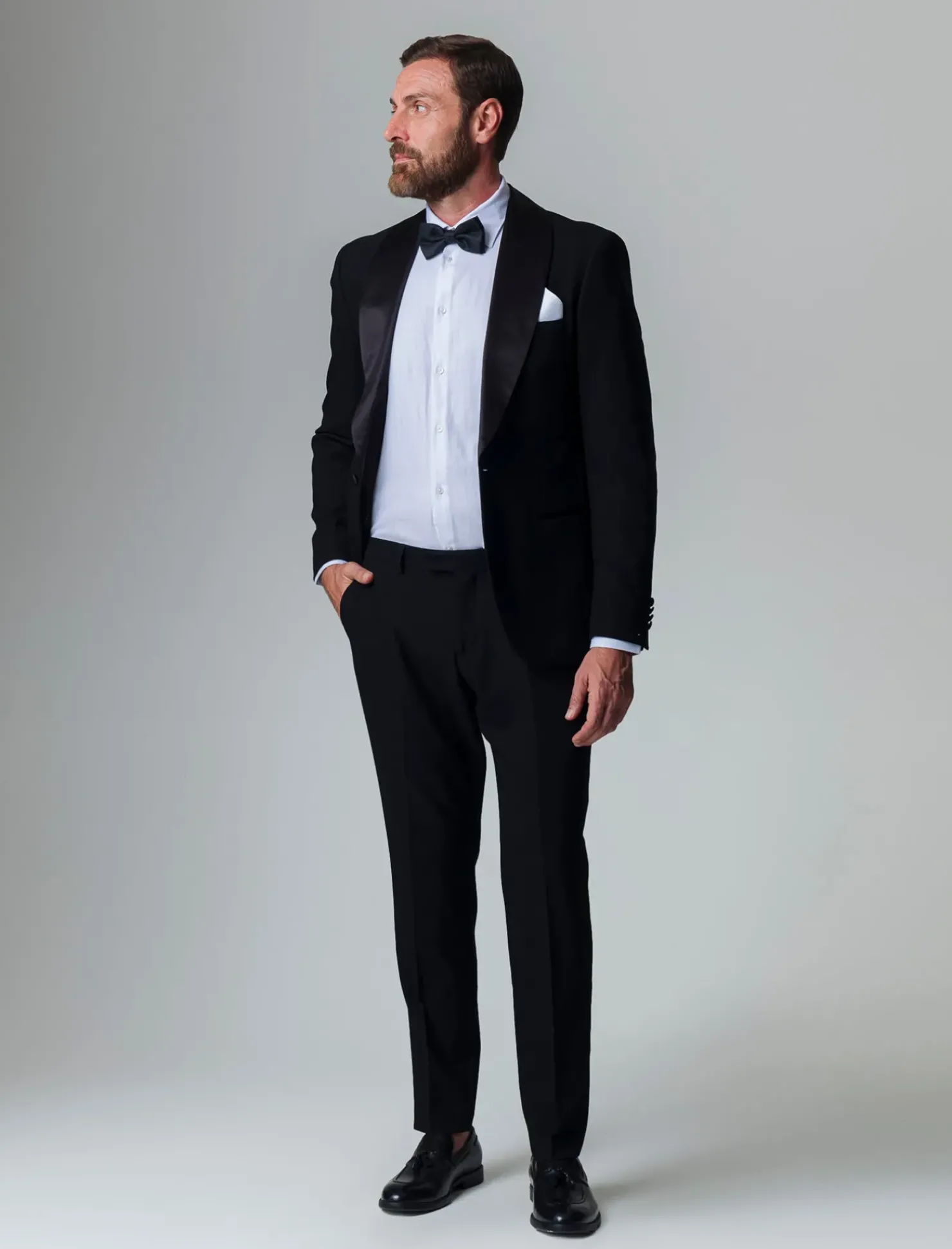 Il blazer da completo smoking formal fit è un capo d’abbigliamento elegante e raffinato, ideale per occasioni formali. Caratterizzato da un sofisticato rever sciallato, questo modello presenta maniche lunghe con un dettaglio di bottoni sui polsini, che aggiunge un tocco di classe. Le tasche a filetto sui fianchi e la tasca interna offrono praticità, mentre la chiusura frontale con un bottone completa il look. Il prodotto è di colore Nero