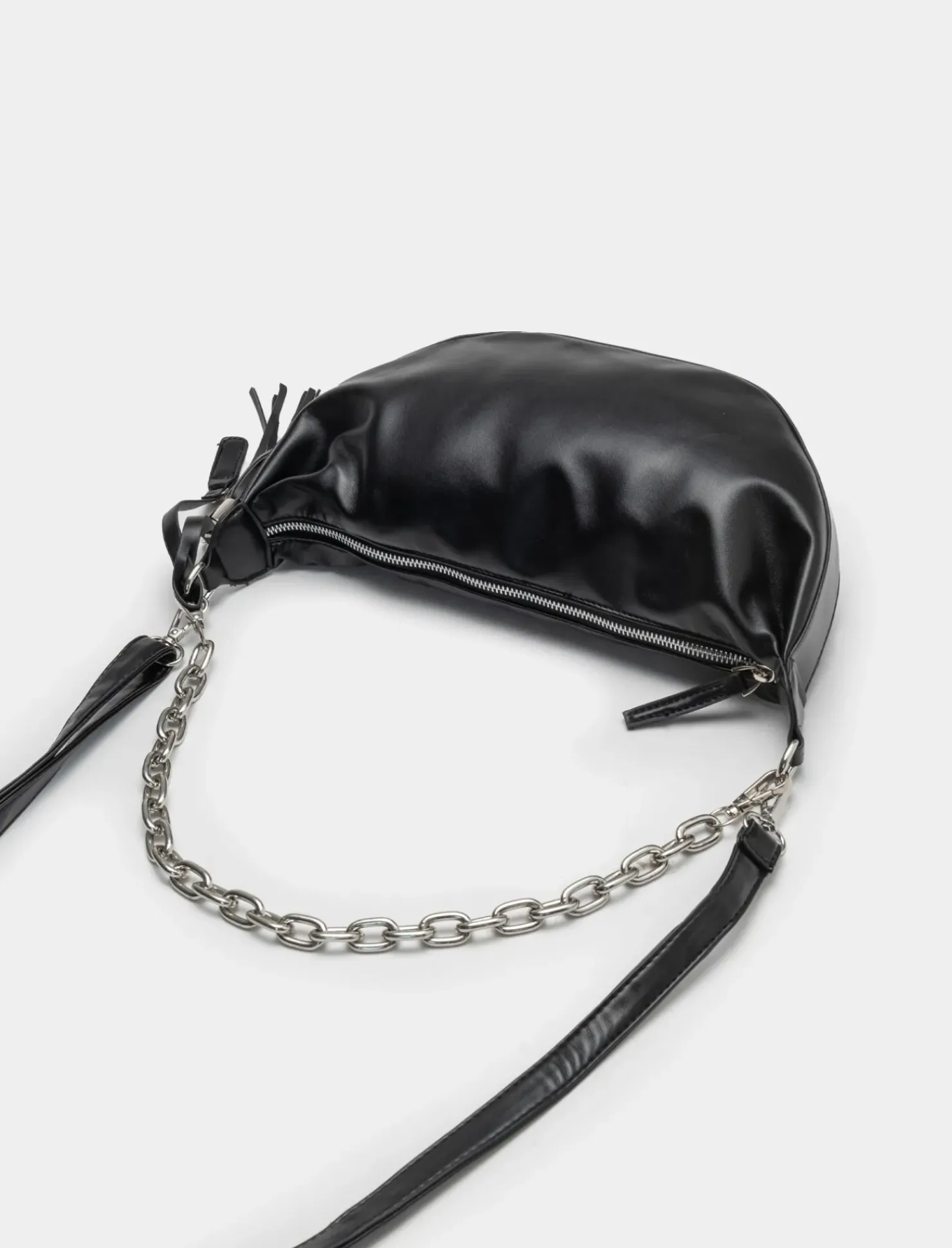 Borsa da donna modello mezzaluna con tracolla a catena, perfetta per completare il tuo outfit con stile. Le dimensioni di 34 cm x 18,5 cm x 5 cm la rendono pratica e capiente per portare con te tutti gli accessori di cui hai bisogno. Il prodotto è di colore Nero