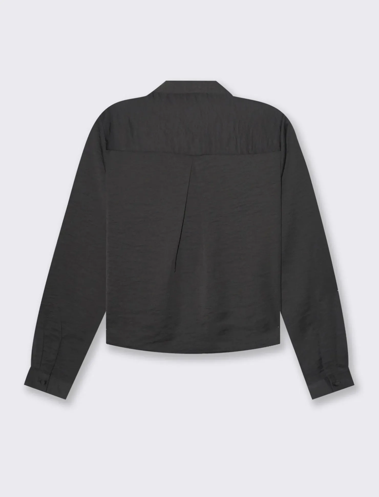 Camicia crop da donna con colletto e maniche lunghe, realizzata in satin. Il design presenta uno scollo a V e una vestibilità slim, arricchita da bottoni ricoperti dello stesso tessuto. Un capo elegante e versatile, perfetto per creare outfit raffinati e alla moda. Il prodotto è di colore Nero