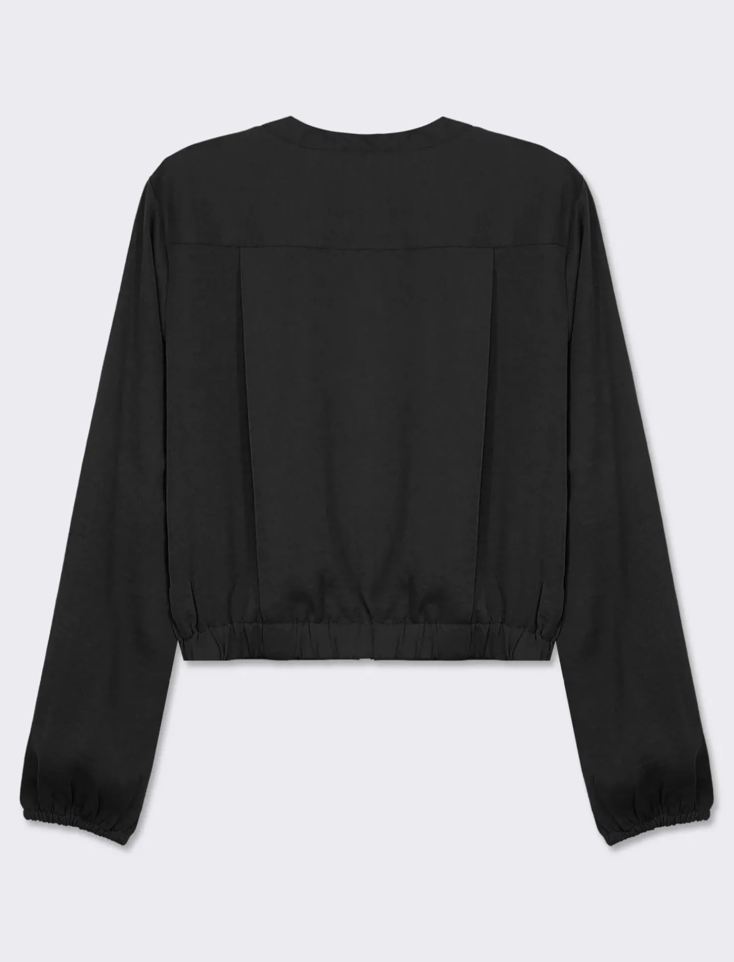 Camicia crop con pieghe per un look trendy e femminile. Realizzata in tessuto cadente, la camicia presenta maniche lunghe e un fondo con pieghe per un effetto sblusato. Disponibile in una varietà di colori per adattarsi a ogni stile e occasione. Ideale da abbinare a pantaloni a vita alta o gonne a ruota per un outfit alla moda e sofisticato. Il prodotto è di colore Nero