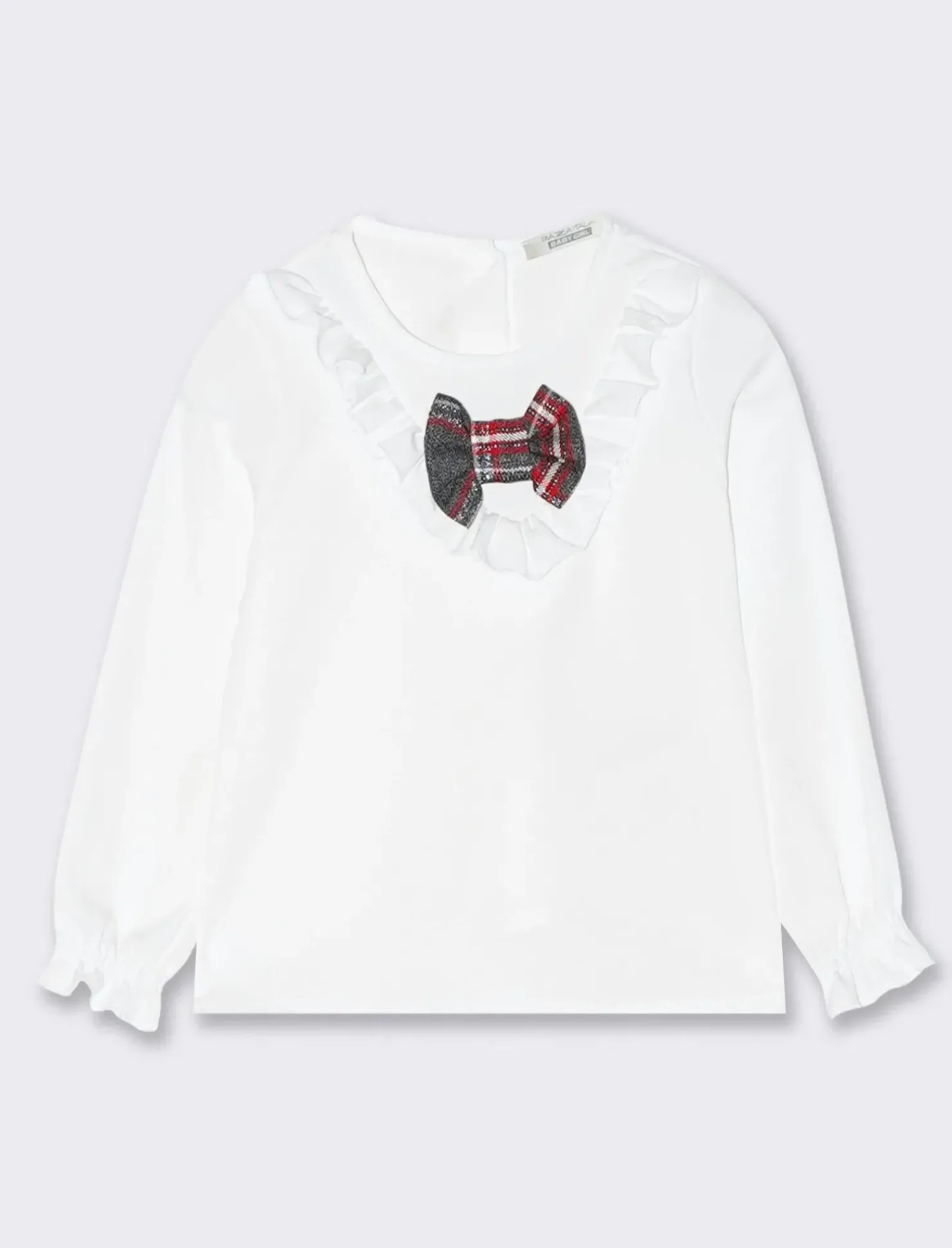 Blusa da neonata in tessuto elastico, con taglio a V sul davanti con rouches. Fiocco decorativo allo scollo e abbottonatura sul dietro con bottoni perlati. Il prodotto è di colore Bianco panna