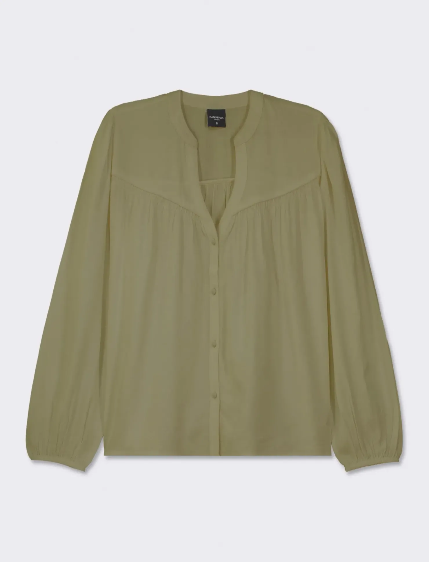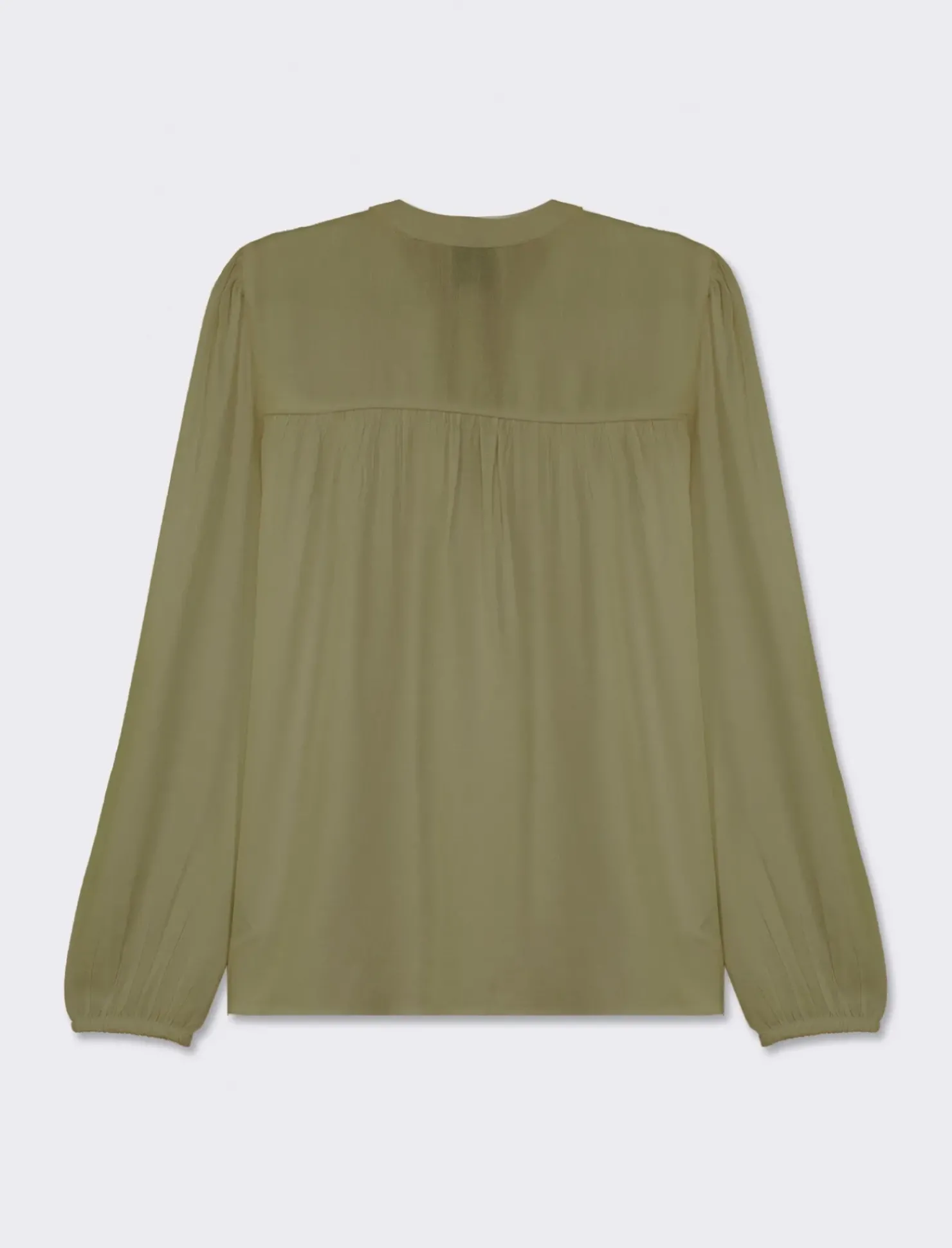 Camicia fluida da donna con collo alla coreana e maniche ampie con elastico. Realizzata con un’applicazione di nervature con arricciatura, questa camicia è perfetta per un look casual ma elegante. Ideale da abbinare a pantaloni o gonne per un outfit versatile e alla moda. Il prodotto è di colore Kaky 1