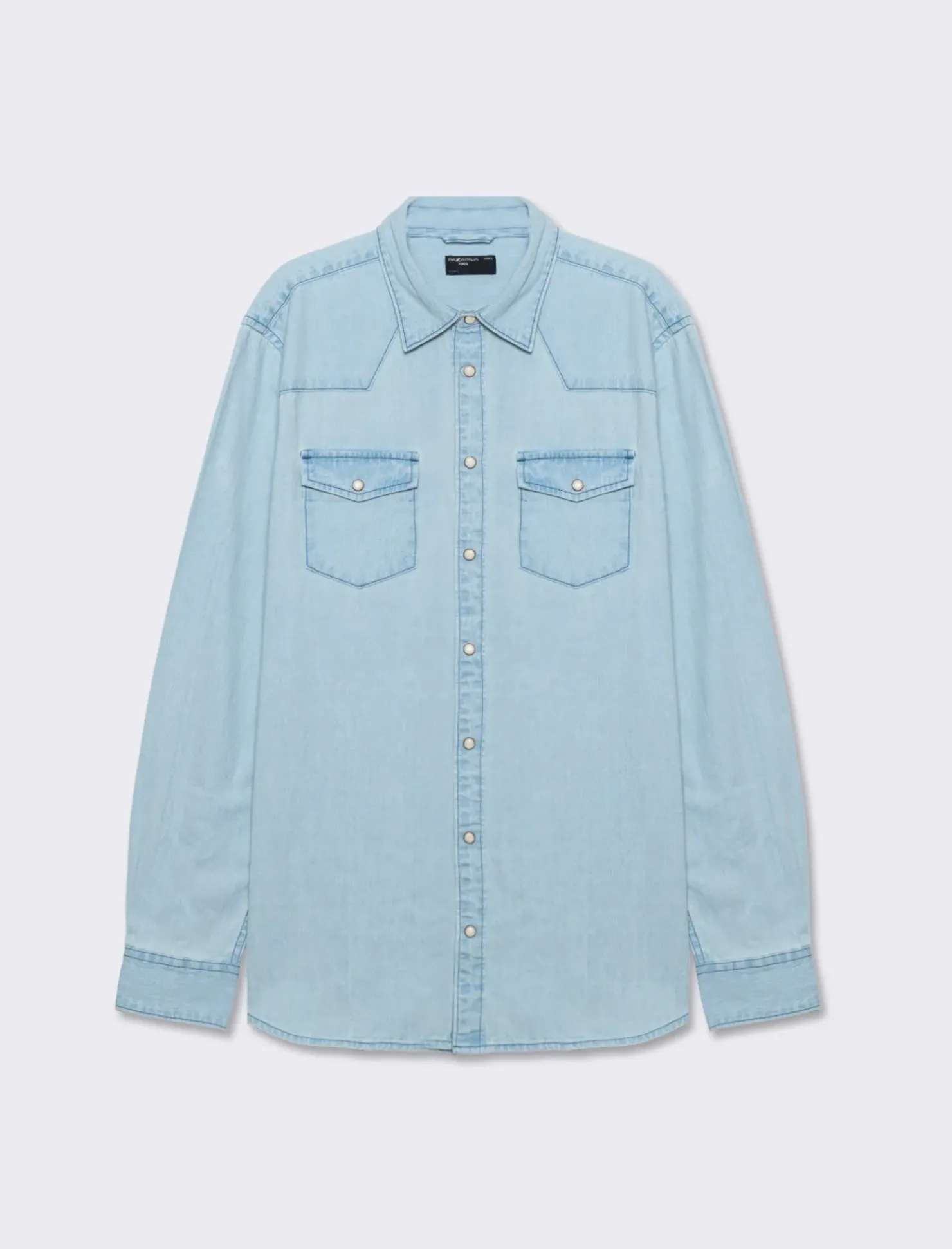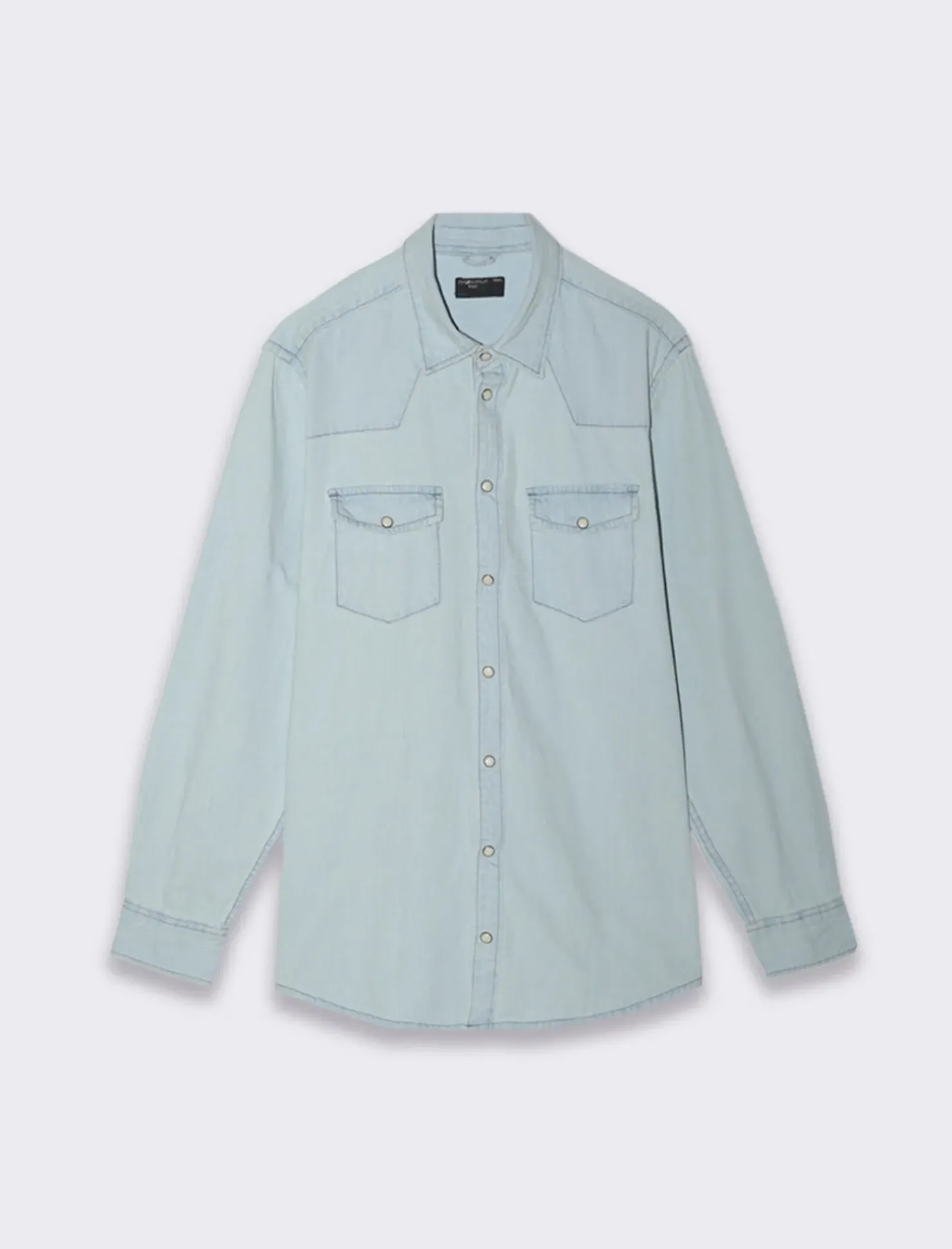 Camicia in denim dal taglio regular fit, ideale per un look casual e versatile. Il colletto a revers conferisce un tocco di eleganza, mentre le maniche lunghe, complete di bottone sul polsino, assicurano comfort e praticità. Le tasche applicate sul petto con patta offrono un elemento funzionale e stiloso. L’effetto slavato aggiunge carattere e originalità, rendendo questa camicia un must-have per l’uomo moderno. La chiusura frontale con bottoni automatici completa il design, rendendola perfetta per ogni occasione. Il prodotto è di colore Denim chiaro