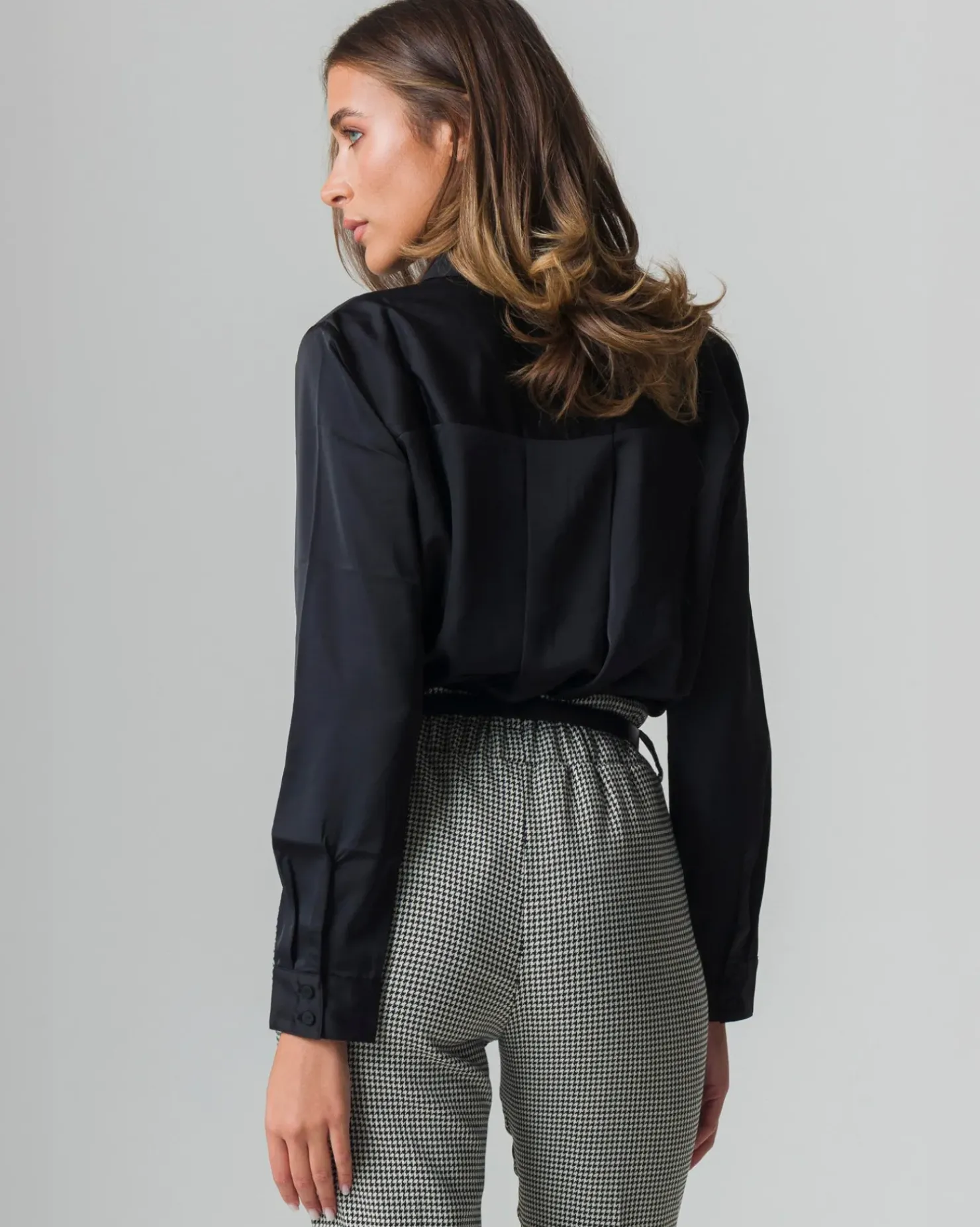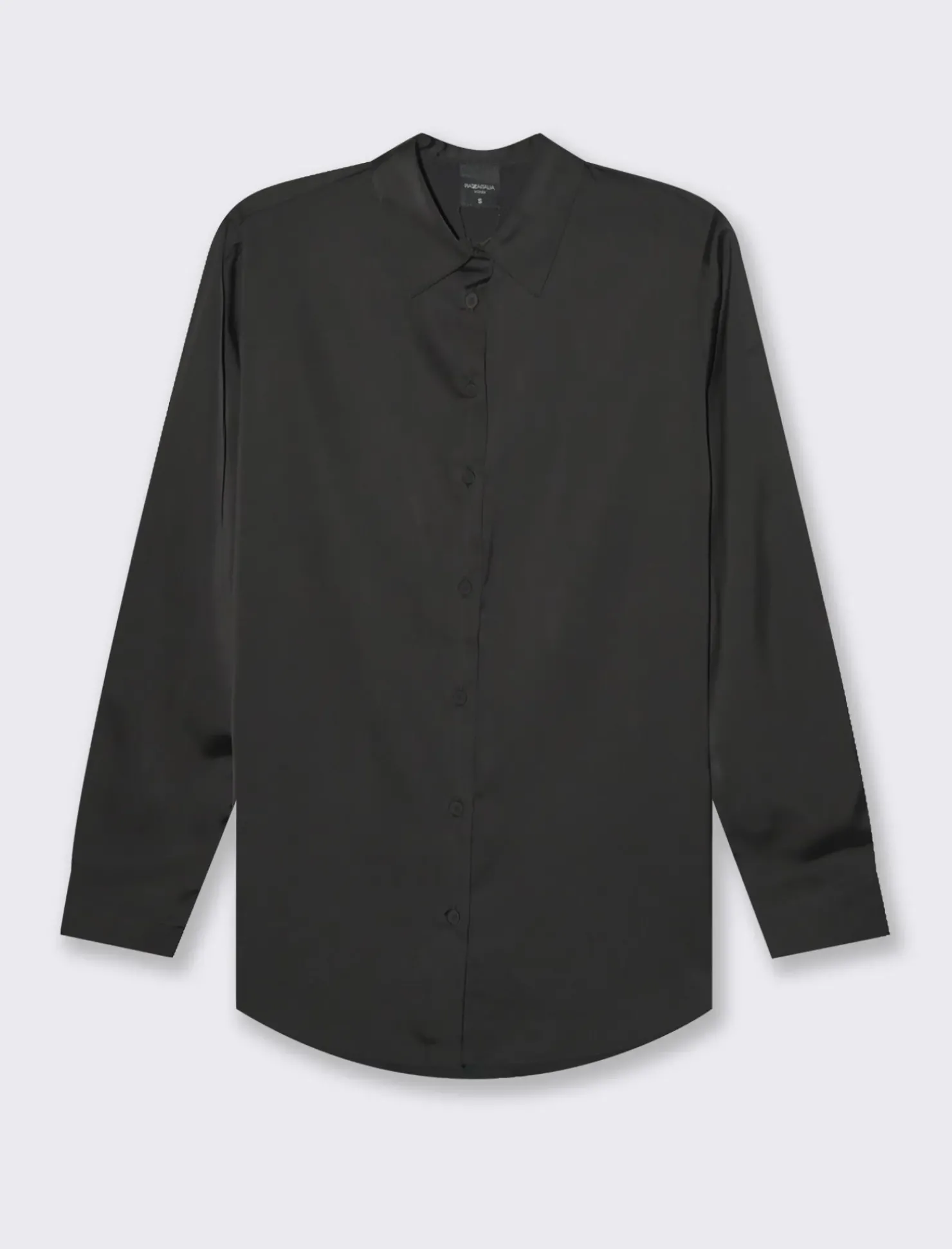 Camicia in satin relaxed fit per donna, caratterizzata da una morbida e fluida texture che avvolge delicatamente la silhouette. Le maniche lunghe offrono un tocco di eleganza, mentre la vestibilità comoda garantisce libertà di movimento. Ideale per ogni occasione, può essere facilmente abbinata a jeans o gonne, rendendo ogni outfit sofisticato e alla moda. Il prodotto è di colore Nero