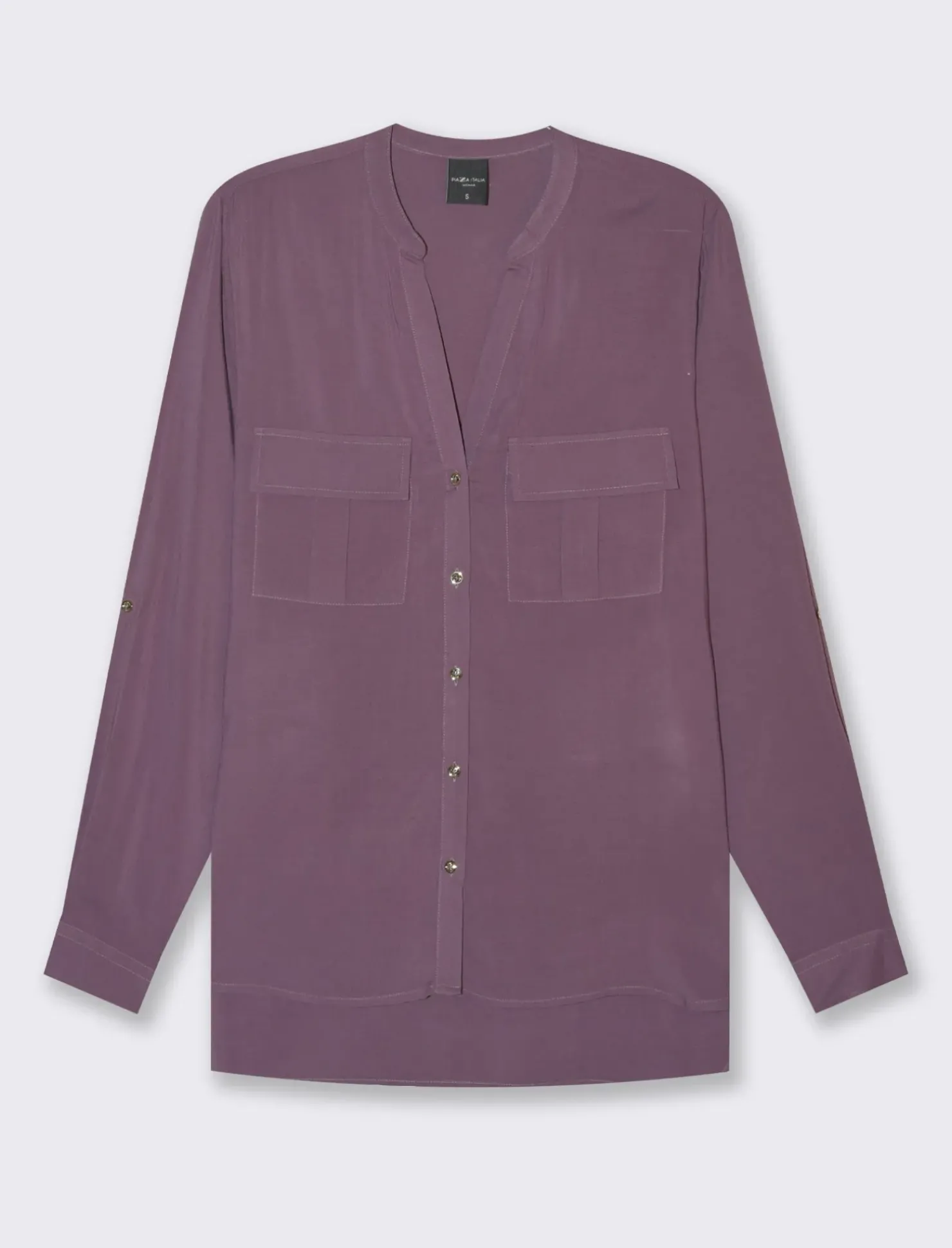 Camicia scollo a V per donna realizzata in morbida viscosa, con maniche lunghe che possono essere risvoltate grazie alle alette. Il particolare scollo a V è impreziosito da bottoni effetto metallo, mentre le tasche applicate aggiungono un tocco di praticità e stile. Il prodotto è di colore Viola malva