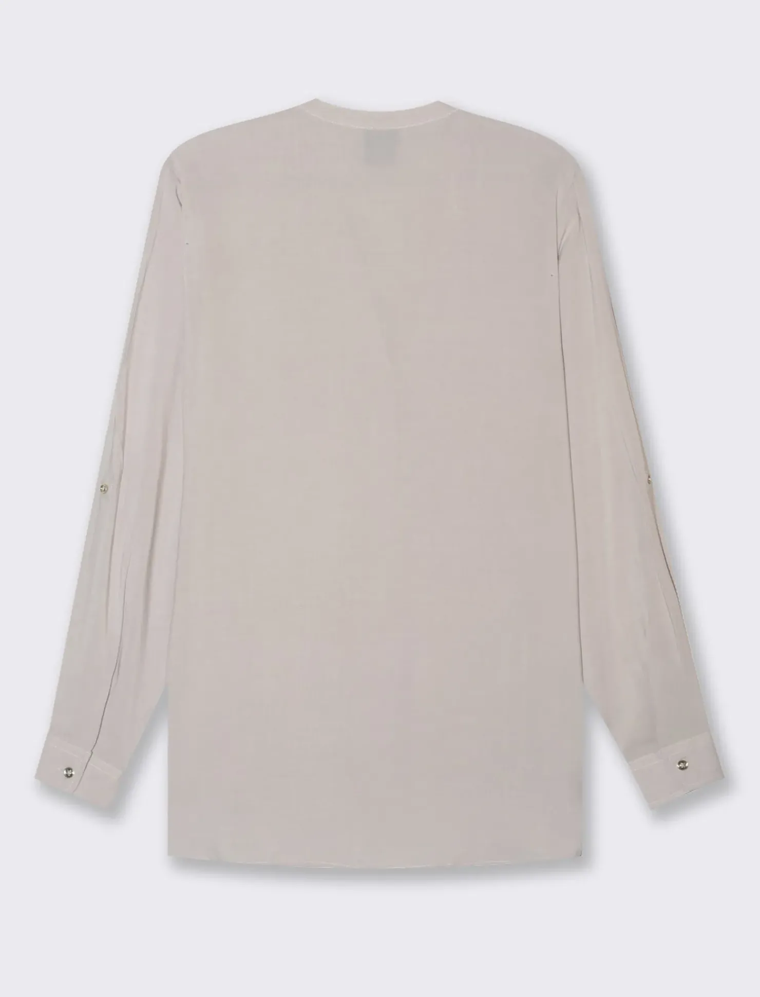 Camicia scollo a V per donna realizzata in morbida viscosa, con maniche lunghe che possono essere risvoltate grazie alle alette. Il particolare scollo a V è impreziosito da bottoni effetto metallo, mentre le tasche applicate aggiungono un tocco di praticità e stile. Il prodotto è di colore Sabbia