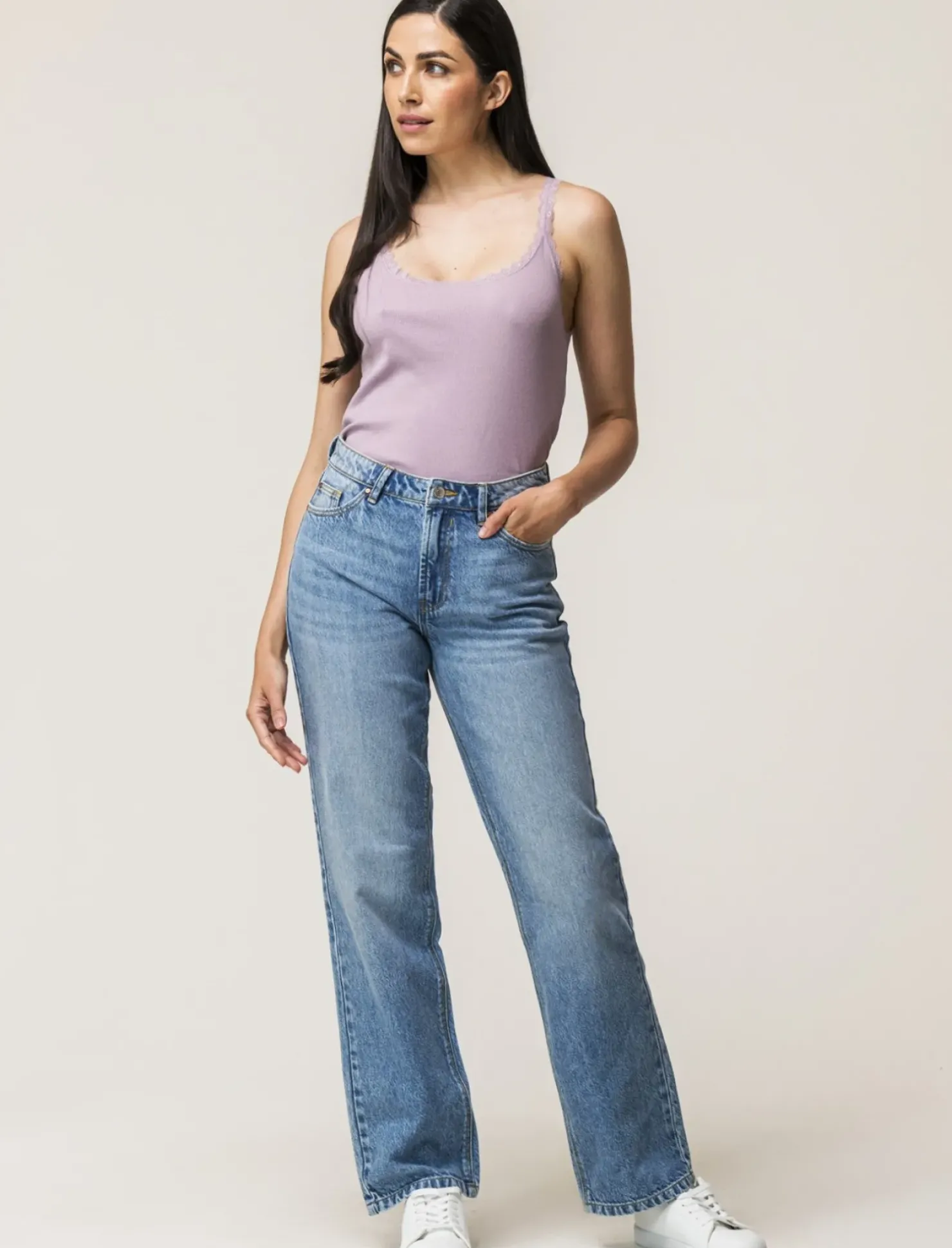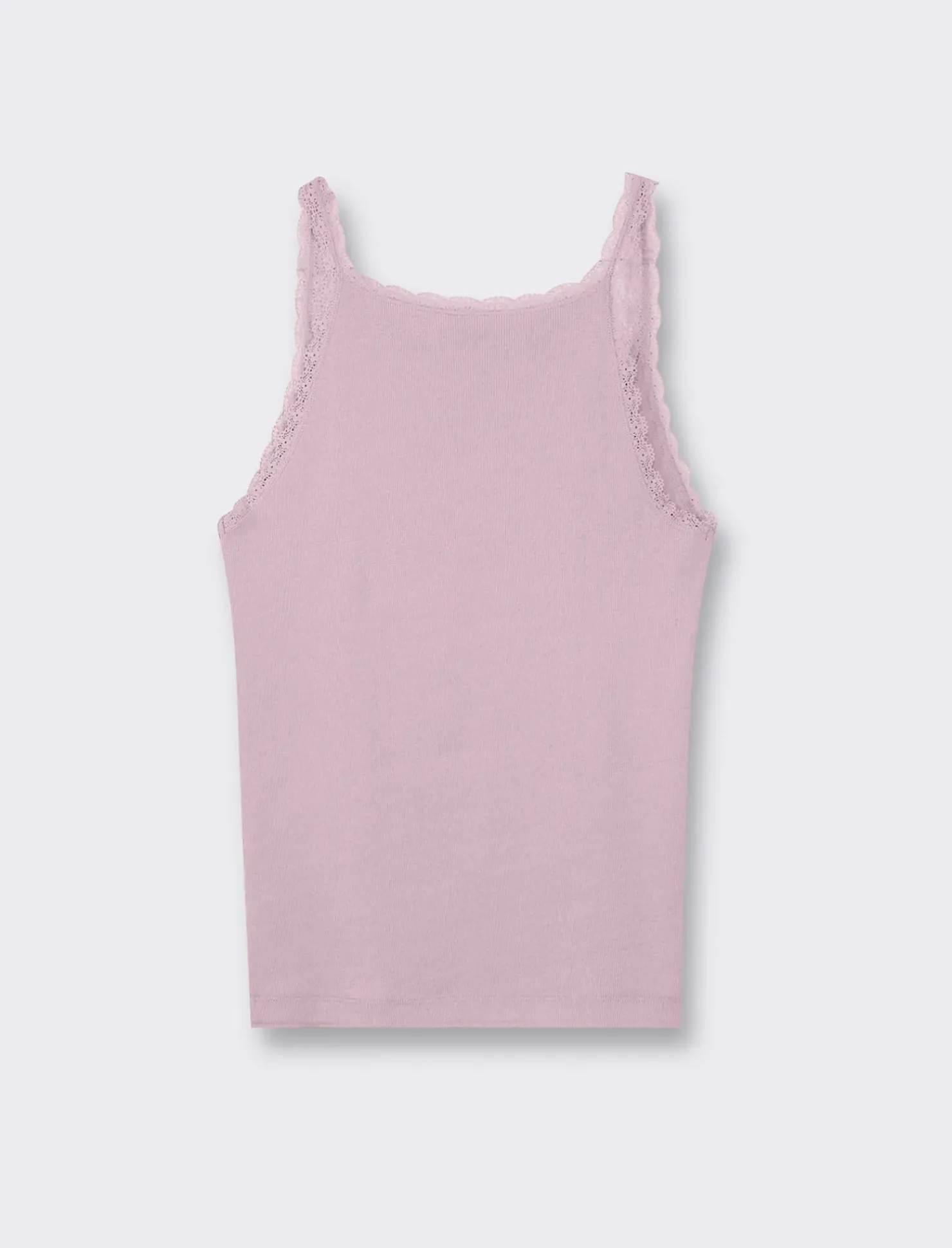 Canotta da donna con scollatura in pizzo e spalline sottili. Il design elegante e femminile si adatta perfettamente al corpo grazie alla vestibilità slim e al tessuto elasticizzato a costina. Disponibile in una varietà di colori, questa canotta è perfetta per creare outfit raffinati e alla moda per ogni occasione. Il prodotto è di colore Viola glicine