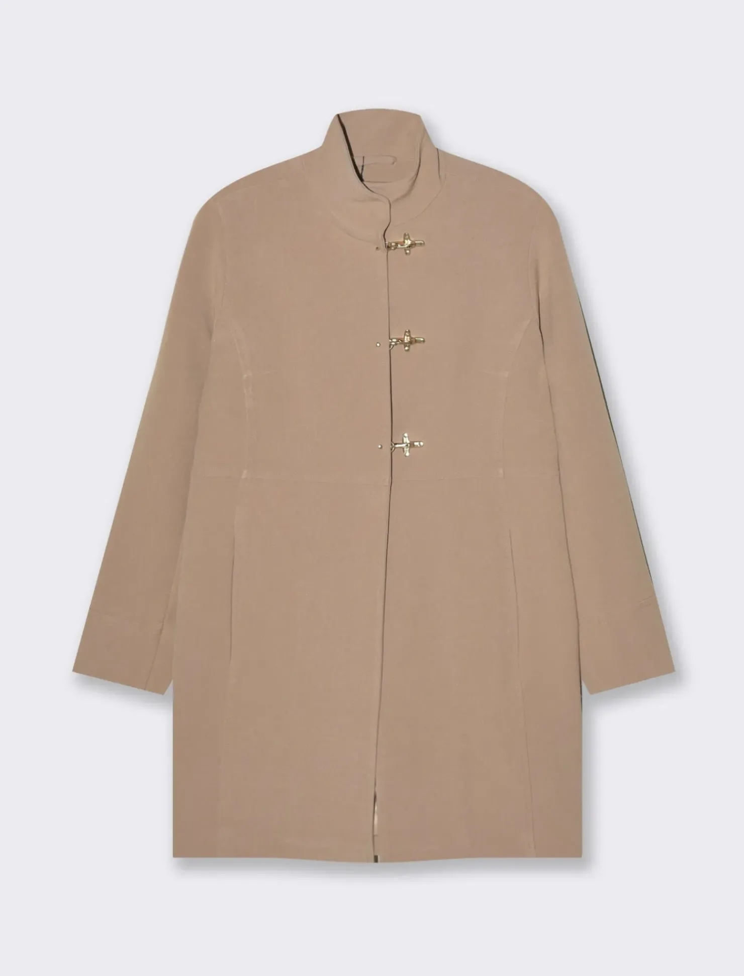 Cappotto basico per donna, caratterizzato da una lunghezza regular e una vestibilità slim che esalta la silhouette. La chiusura è dotata di eleganti alamari in metallo, conferendo un tocco di raffinatezza al design. Lo spacco posteriore offre libertà di movimento, rendendolo ideale per ogni occasione. Perfetto per completare outfit sia casual che più formali, questo cappotto rappresenta un elemento essenziale nel guardaroba femminile. Il prodotto è di colore Cammello