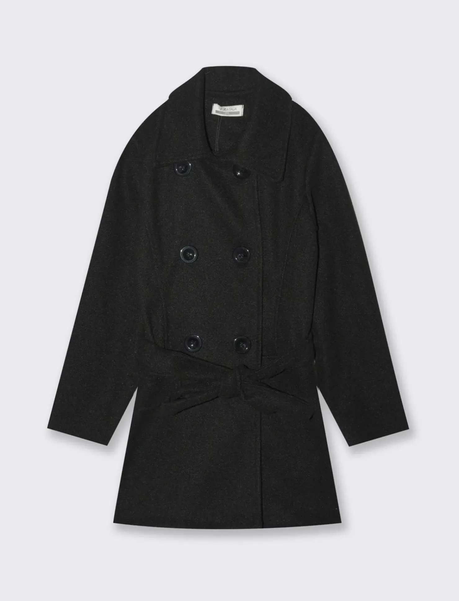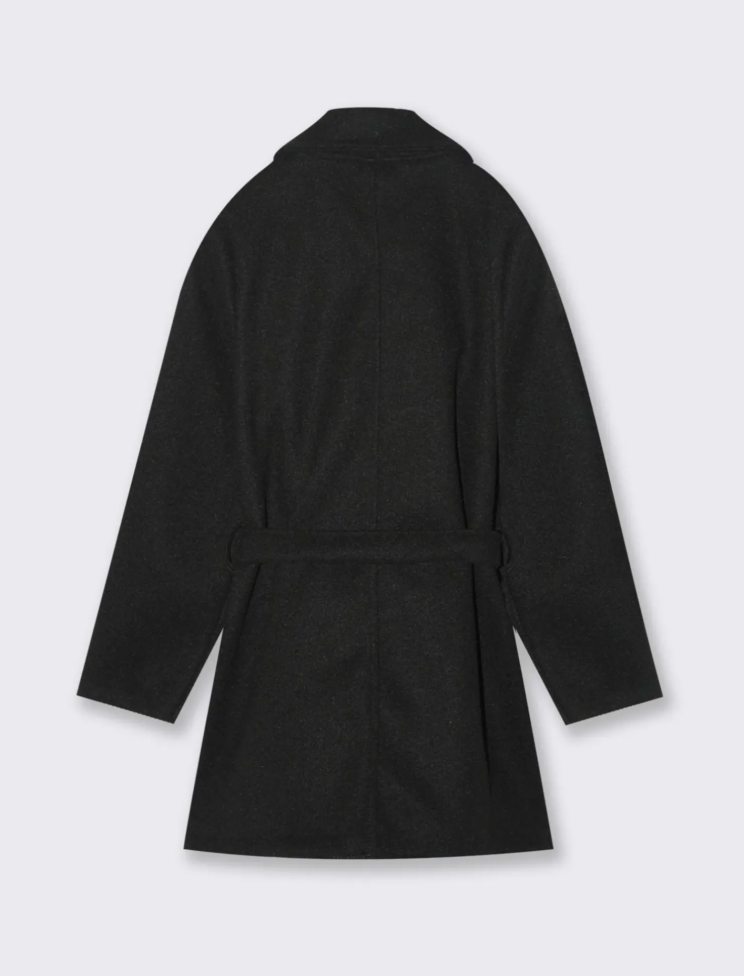 Cappotto doppio petto con cintura in vita, in morbido panno. Il prodotto è di colore Nero