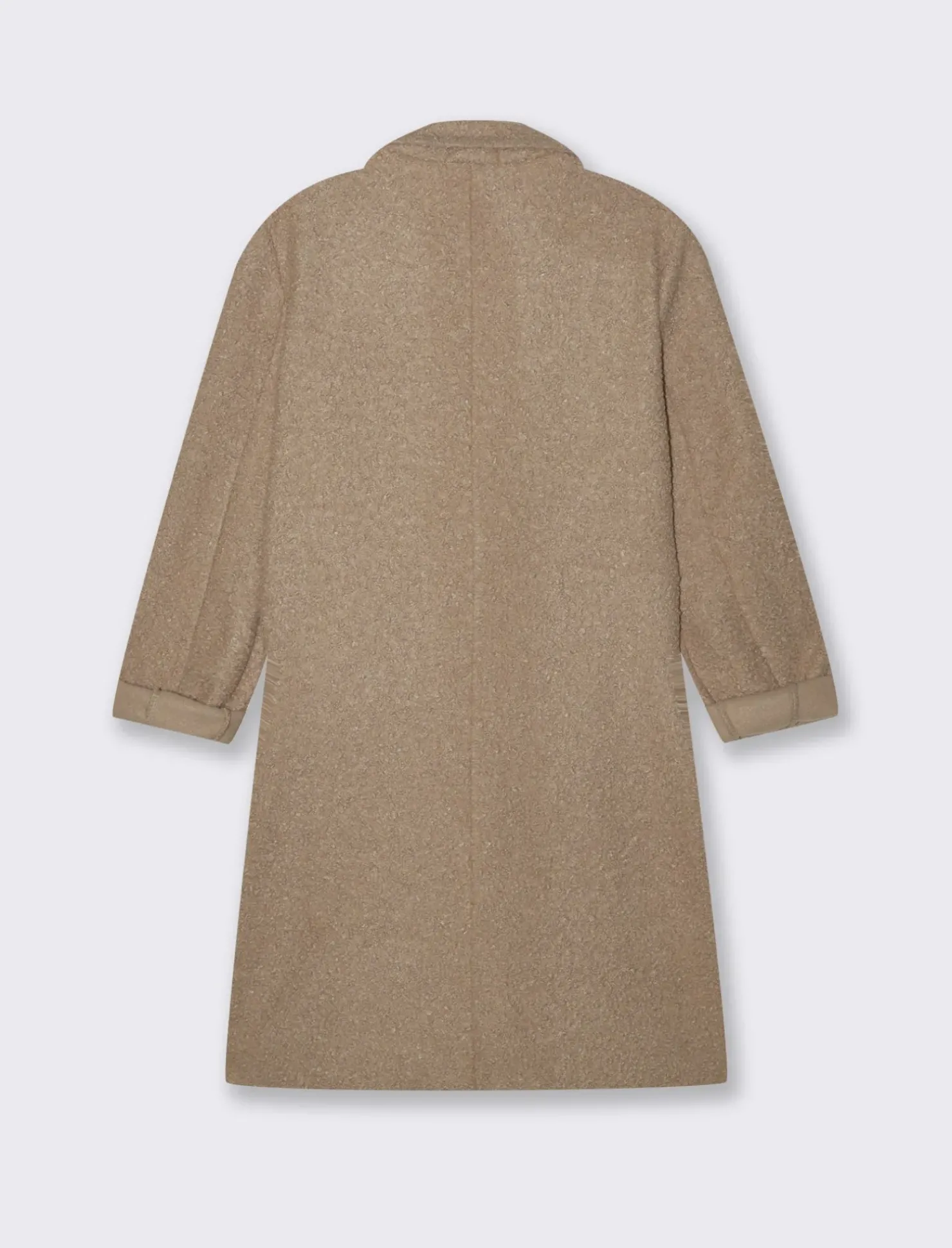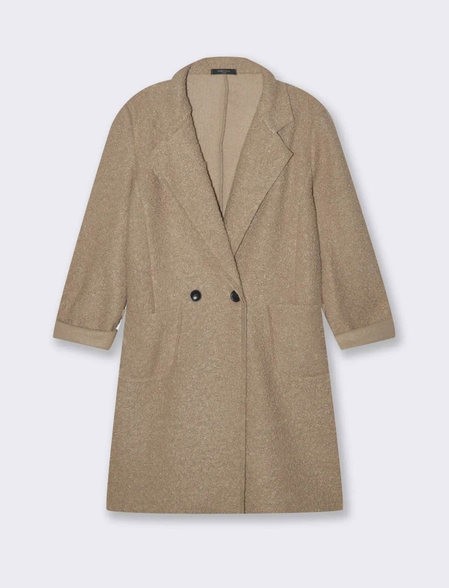 CAPPOTTO CON COLLO REVERSE IN TESSUTO BOUCLE’. TASCHE A TOPPA SUL DAVANTI Il prodotto è di colore Sabbia