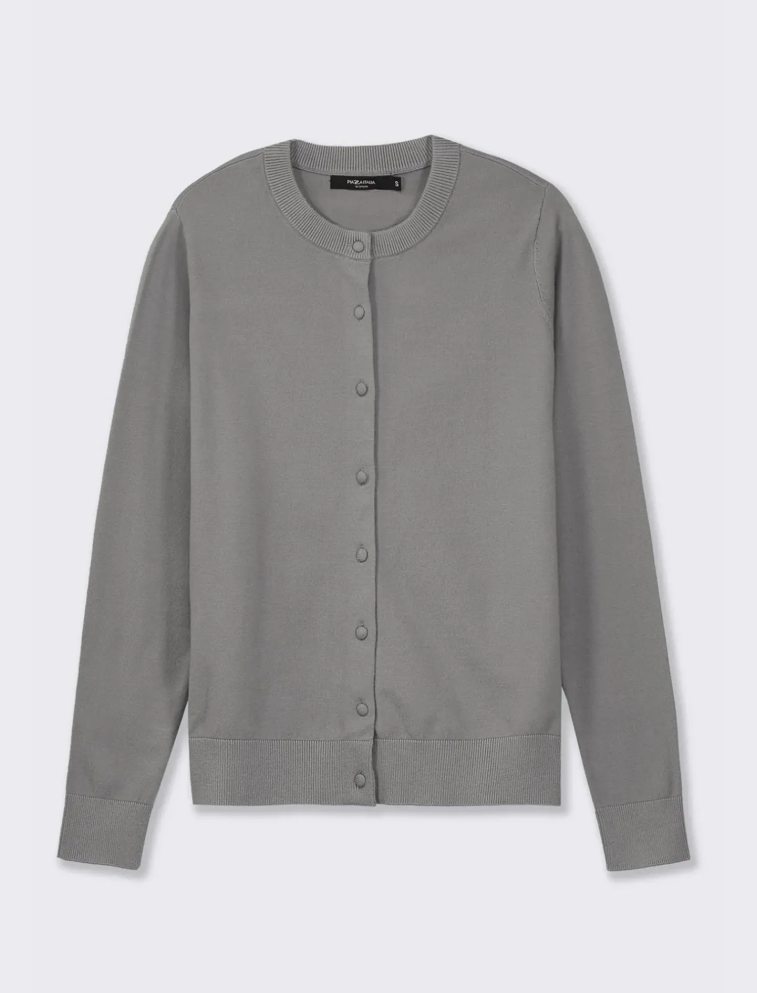 Cardigan in maglia fine, perfetto per completare il tuo look con stile e comfort. Il modello girocollo si adatta perfettamente alla silhouette femminile, mentre i bottoni effetto smaltato aggiungono un tocco di eleganza. Disponibile in una varietà di colori per soddisfare ogni esigenza di stile. Il prodotto è di colore Antracite melange