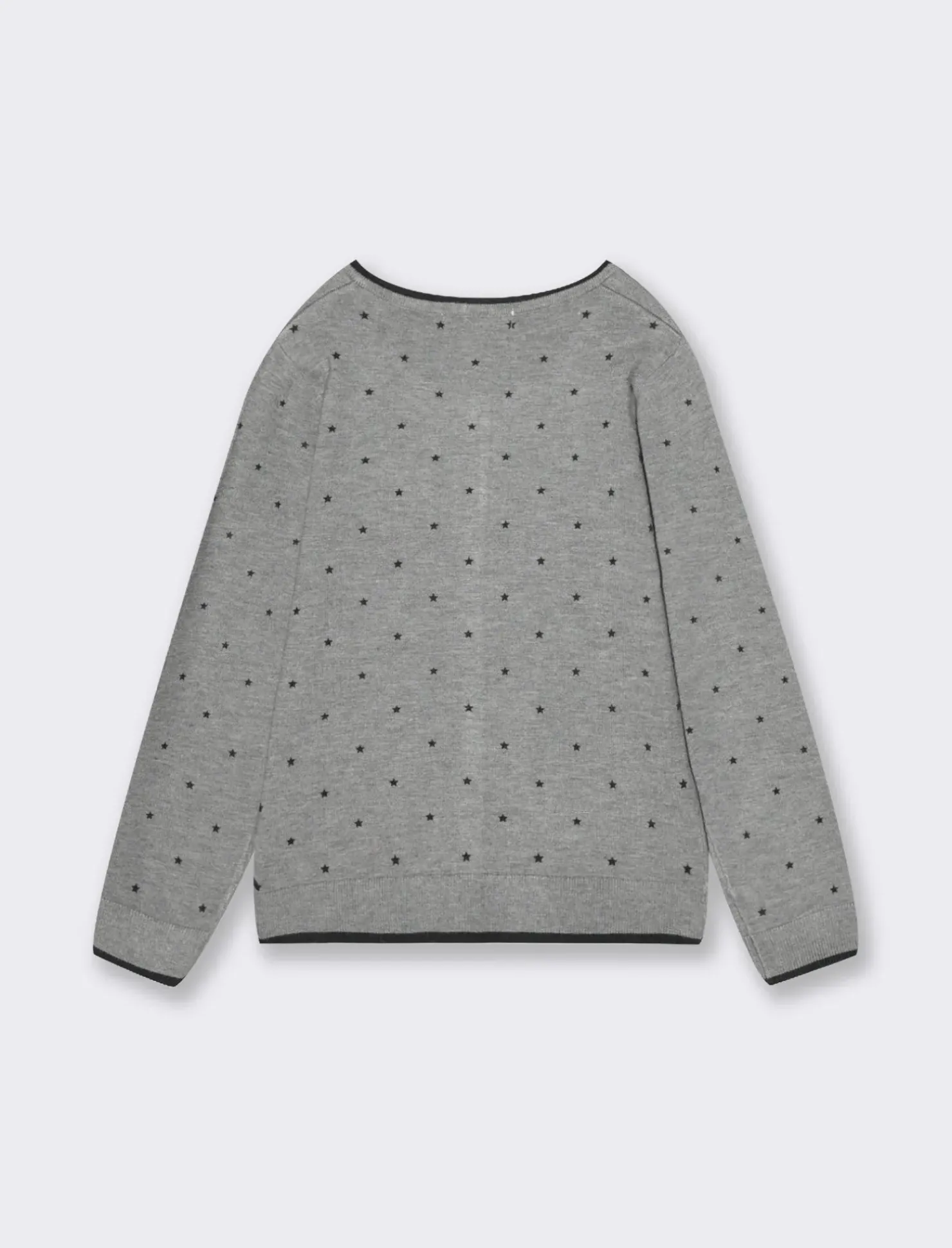 Cardigan da bambina con bottoni e stampa flock. Perfetto per completare ogni outfit con stile e comfort. Realizzato in morbida maglieria, con bottoni perlati e una graziosa stampa su tutto il capo. Un capo versatile e alla moda, ideale per le piccole fashioniste di casa. Il prodotto è di colore Grigio mel.