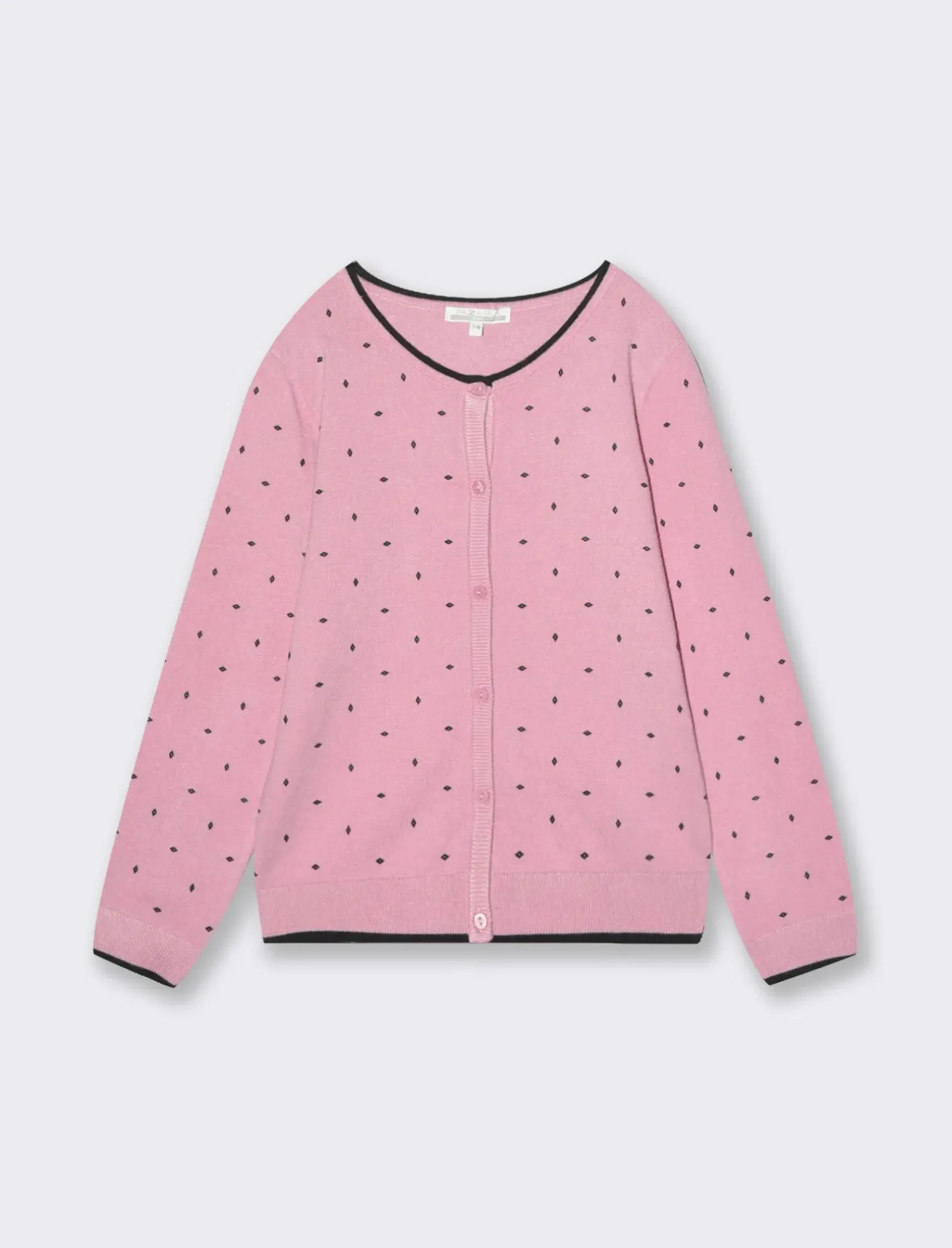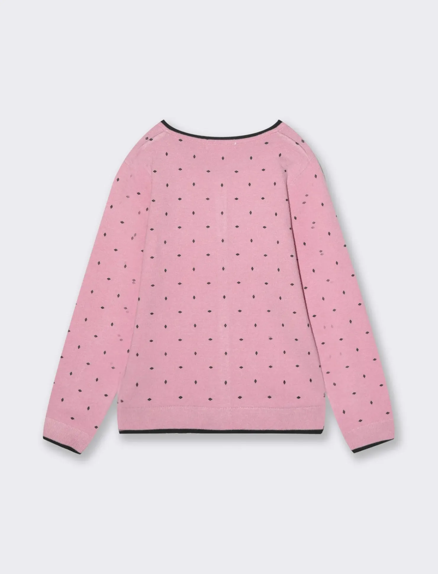 Cardigan da bambina con bottoni e stampa flock. Perfetto per completare ogni outfit con stile e comfort. Realizzato in morbida maglieria, con bottoni perlati e una graziosa stampa su tutto il capo. Un capo versatile e alla moda, ideale per le piccole fashioniste di casa. Il prodotto è di colore Rosa