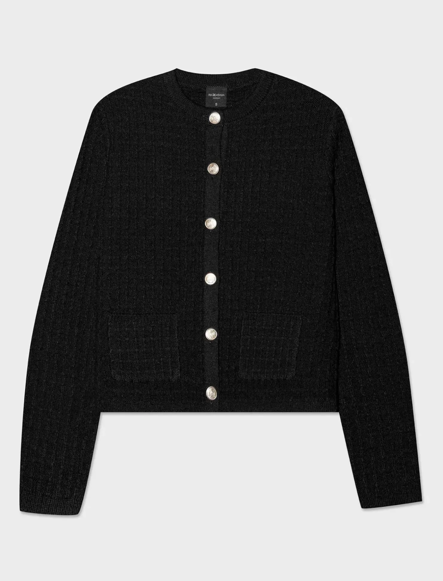 Cardigan corto con bottoni effetto metallo per una donna moderna e sofisticata. Realizzato in morbida maglia, questo cardigan presenta bottoni utilites dorati e tasche a toppa. La vestibilità slim valorizza la silhouette femminile, rendendo questo capo un must-have per un look elegante e alla moda. Il prodotto è di colore Nero
