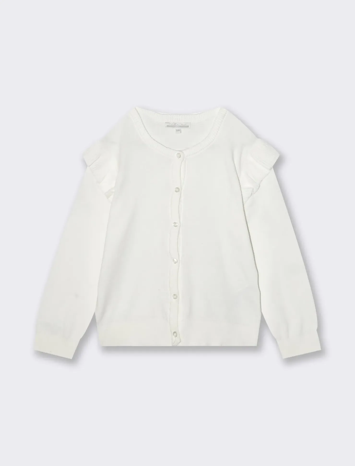 Cardigan in cotone per bambina, perfetto per completare ogni outfit con stile e comfort. Realizzato in morbida maglia di cotone, presenta graziose rouches sulle spalle e una pratica abbottonatura sul davanti. La vestibilità regolare assicura libertà di movimento per le piccole fashioniste di casa. Il prodotto è di colore Bianco
