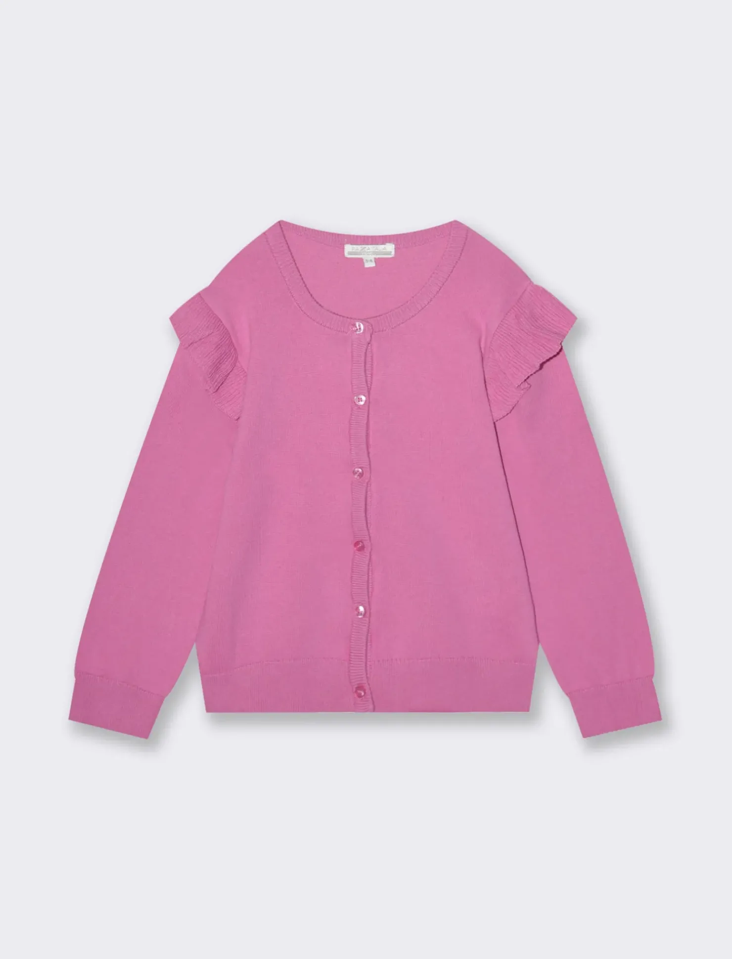 Cardigan in cotone per bambina, perfetto per completare ogni outfit con stile e comfort. Realizzato in morbida maglia di cotone, presenta graziose rouches sulle spalle e una pratica abbottonatura sul davanti. La vestibilità regolare assicura libertà di movimento per le piccole fashioniste di casa. Il prodotto è di colore Rosa