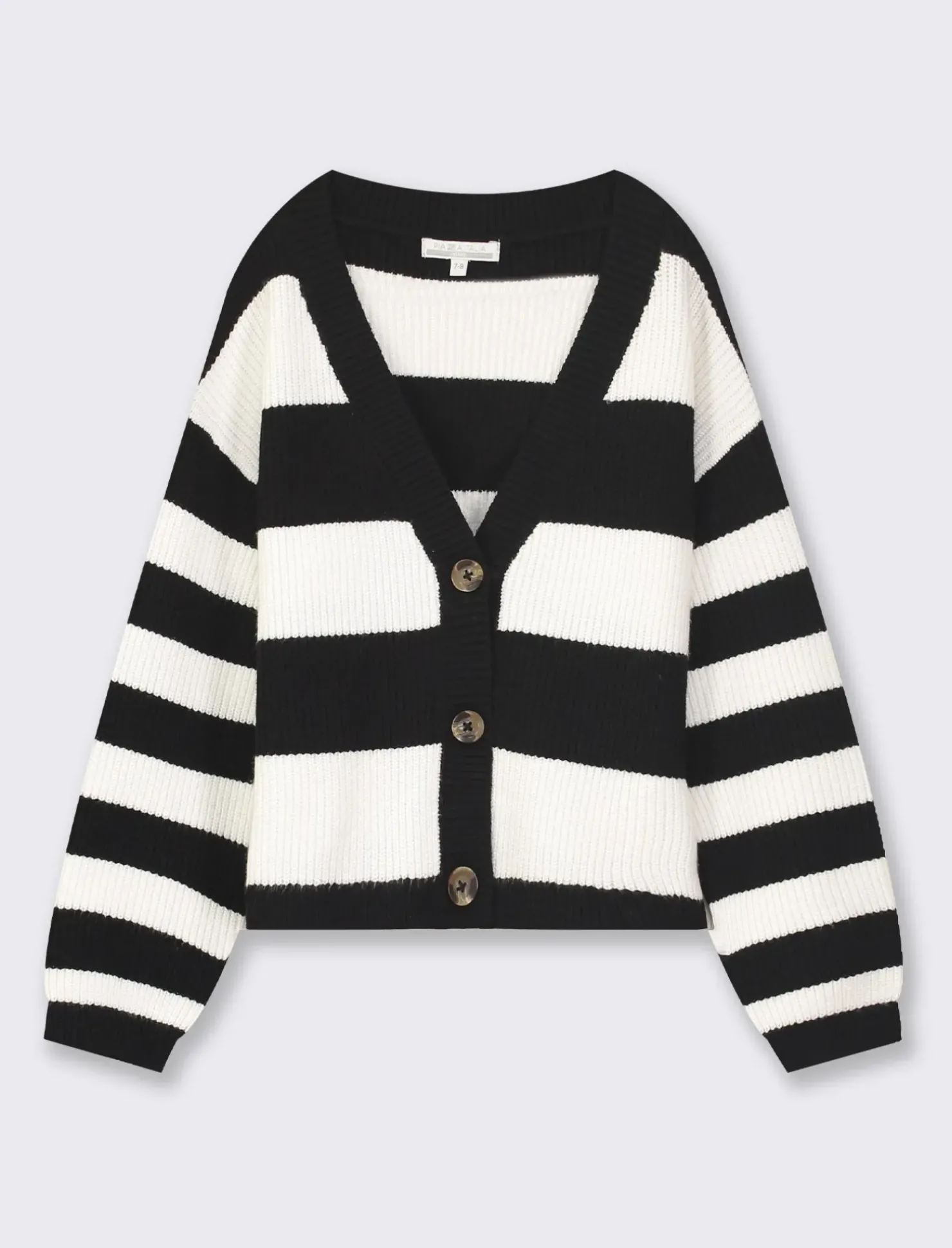 Cardigan a righe per bambina realizzato in morbida poliviscosa. Perfetto per completare ogni outfit con stile e comfort. Le righe colorate donano un tocco giocoso e allegro, ideale per le piccole fashioniste. Un capo versatile e pratico, adatto a ogni occasione. Il prodotto è di colore Righe