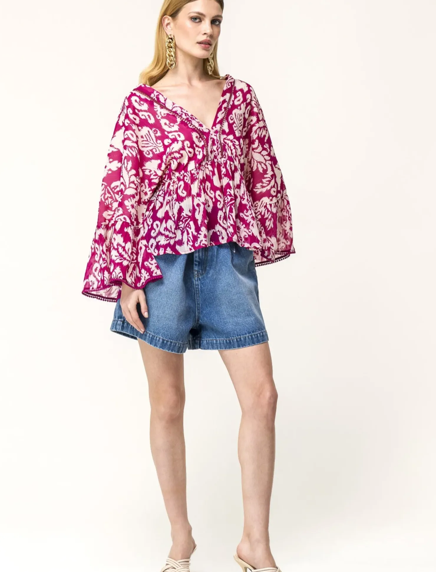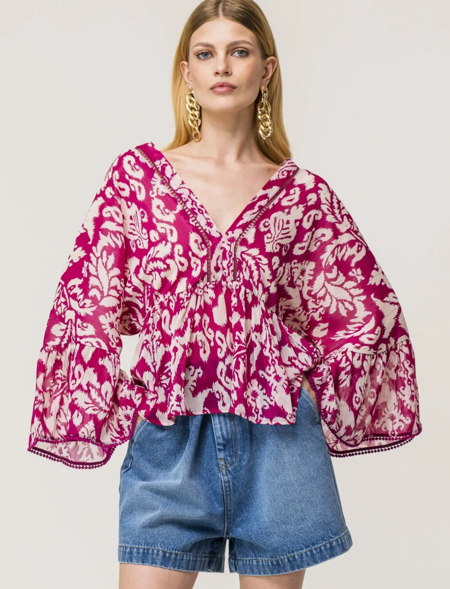 Casacca ampia stampata con scollo a V, perfetta per un look elegante e sofisticato. Realizzata in tessuto leggero, presenta inserti metallizzati che aggiungono un tocco di luminosità al capo. Ideale per un’occasione speciale o per un look da giorno raffinato e alla moda. Il prodotto è di colore var 2