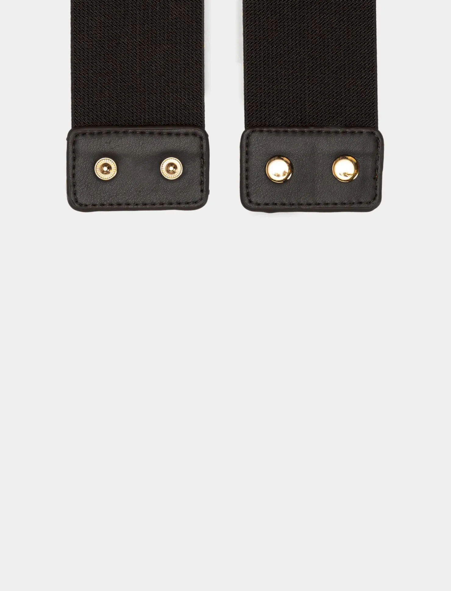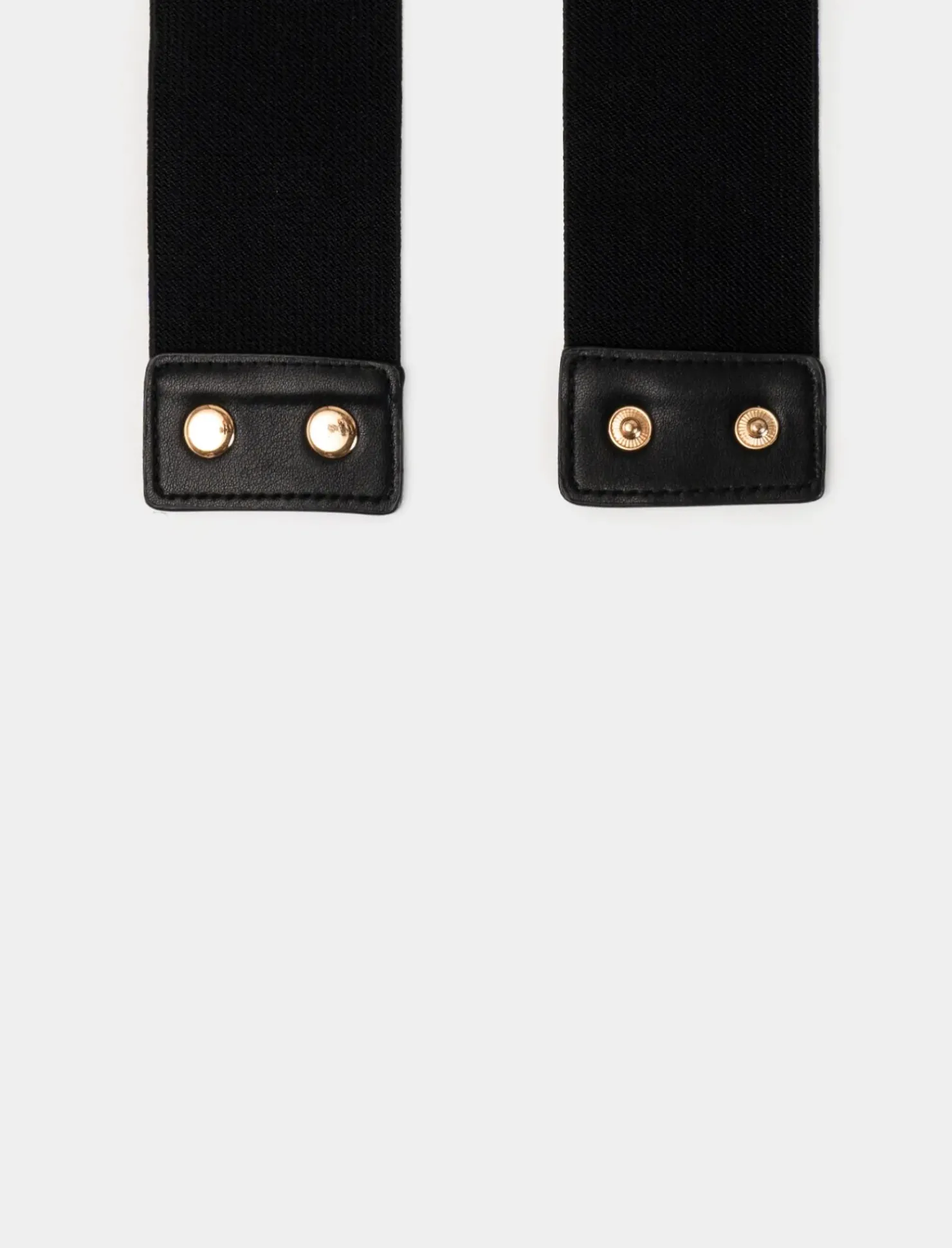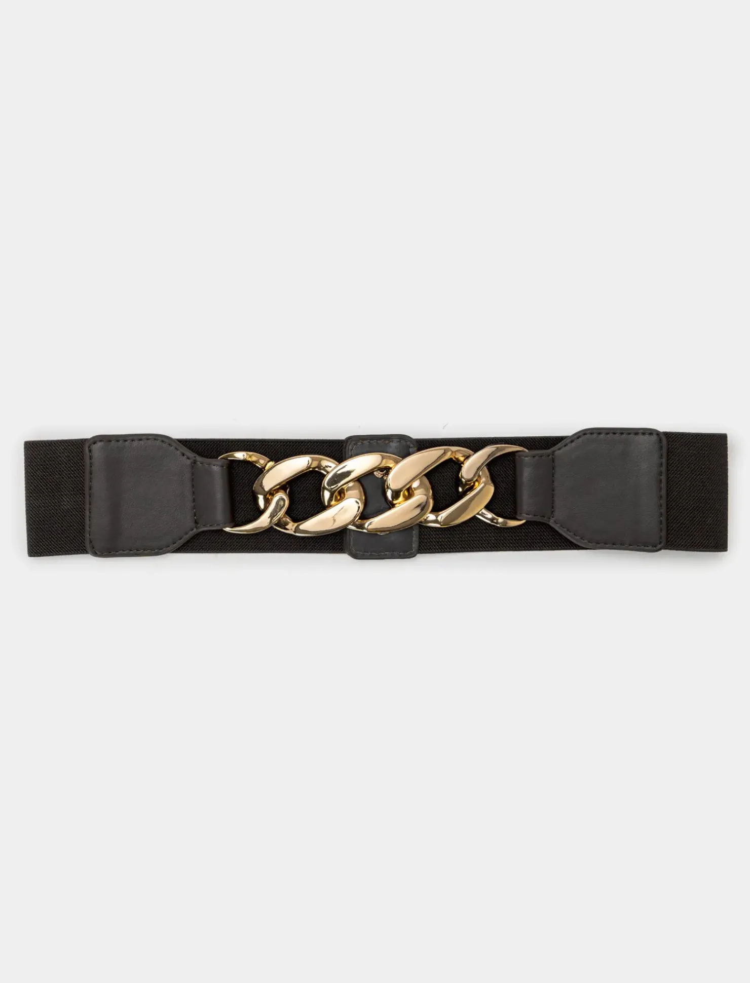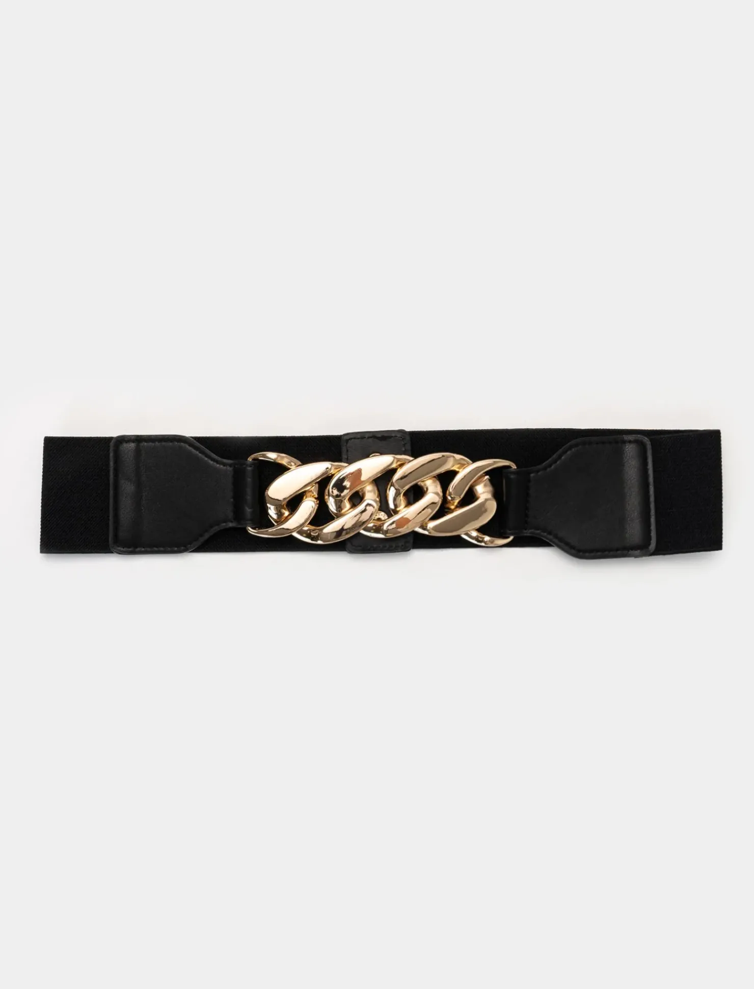 Cintura da donna elastica con catena sottoseno, disponibile nella misura 70 x 80 cm. Un accessorio elegante e versatile, perfetto per completare ogni outfit con stile e personalità. Il prodotto è di colore Nero-oro