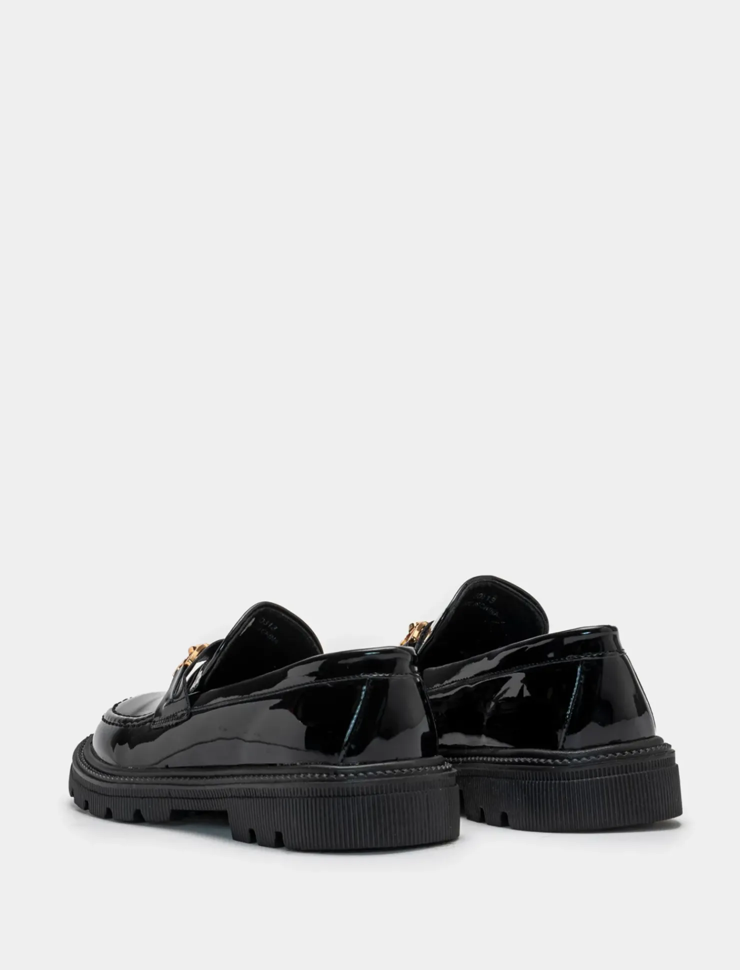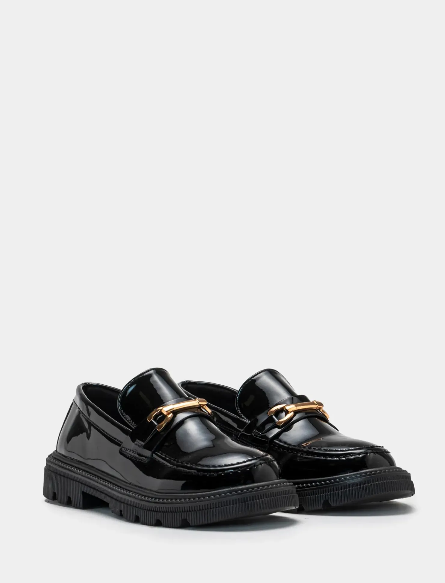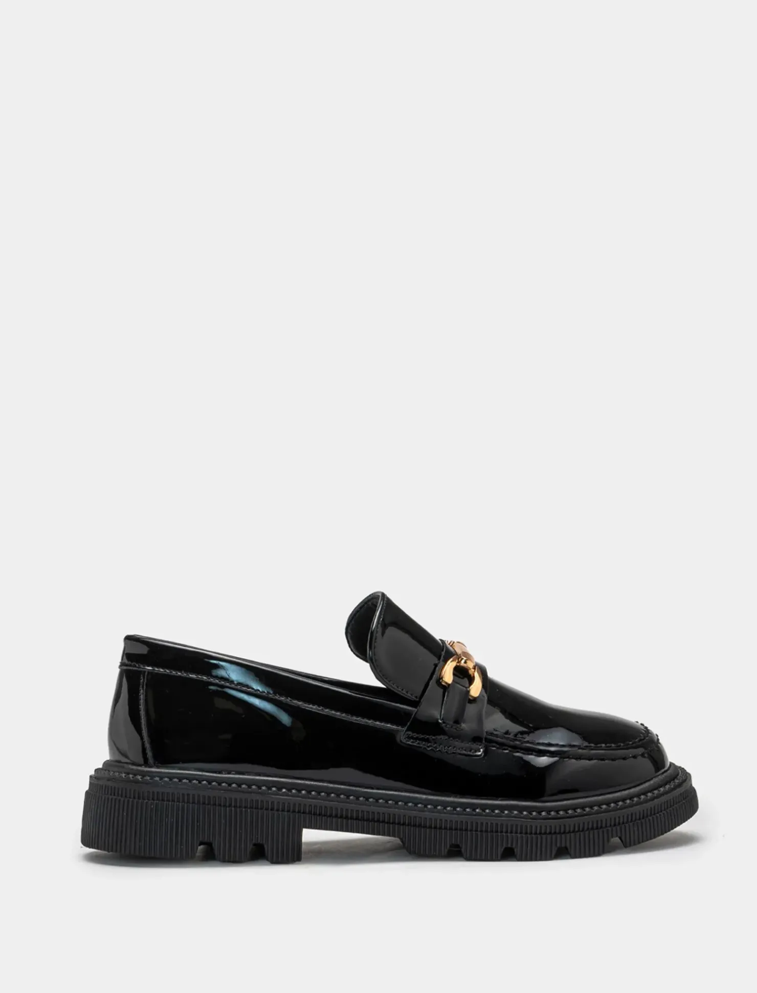 Le scarpe da college nere in vernice sono un must-have per un look elegante e sofisticato. Realizzate in resistente poliuretano, presentano una catena dorata che aggiunge un tocco di classe. Il fondo roccia assicura una perfetta aderenza e comfort durante tutto il giorno. Il prodotto è di colore Nero