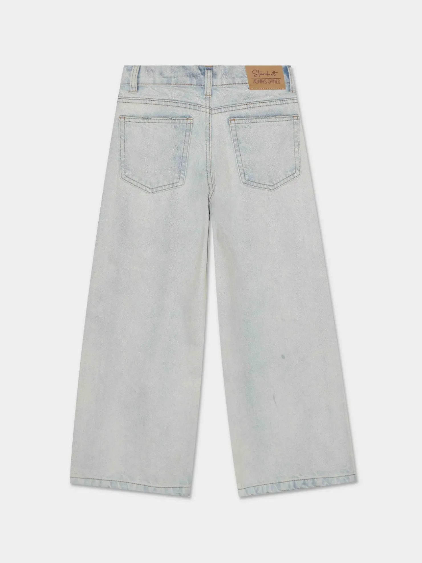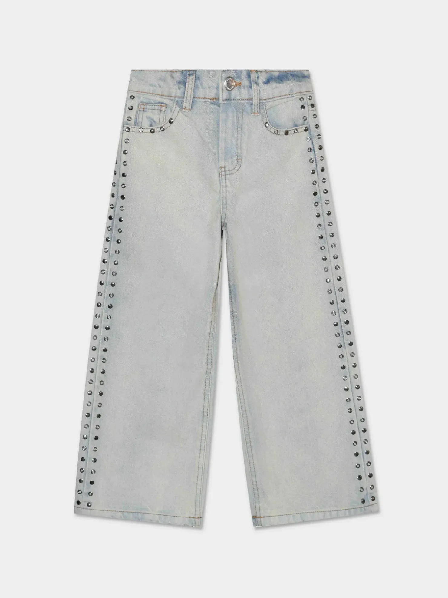 Pantaloni in denim a palazzo per bambina con un design trendy e ricercato. Il lavaggio sabbiato conferisce un tocco di originalità, mentre le borchiette applicate sulla parte laterale e sulle tasche aggiungono un tocco di stile in più. Il prodotto è di colore Denim