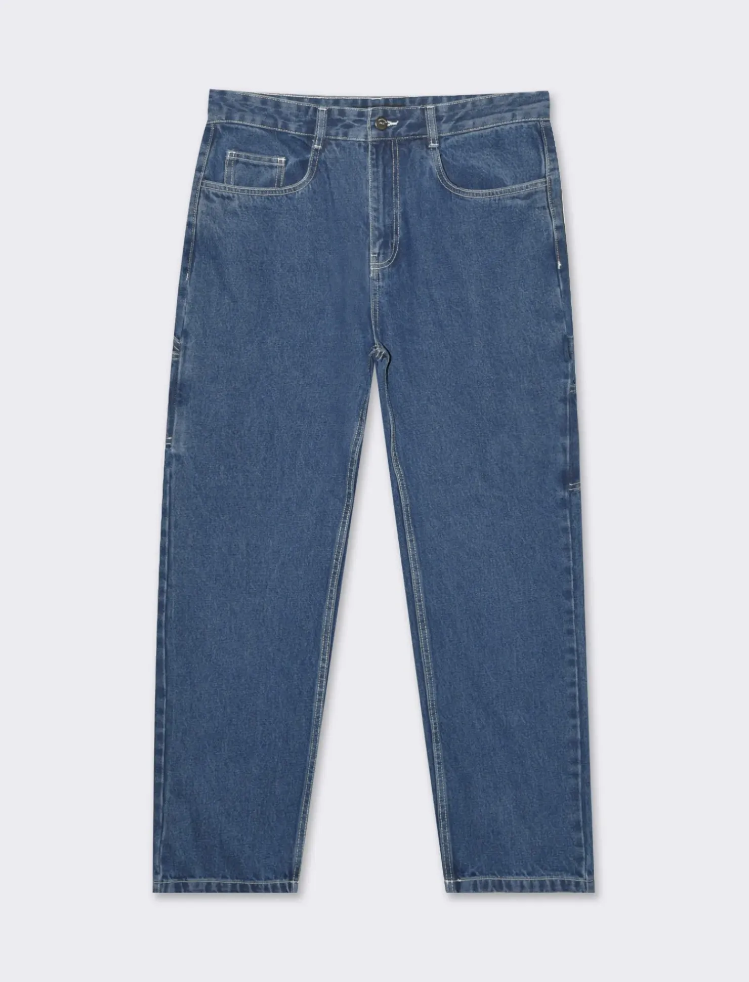 Jeans carpenter fit per uomo, perfetti per un look casual e alla moda. Realizzati in resistente tessuto denim di cotone, di colore blu medio con effetto slavato. Dotati di cinque tasche e chiusura anteriore con cerniera e bottone. Le tasche laterali applicate aggiungono un tocco di stile unico. Un capo versatile e comodo, ideale per ogni occasione. Il prodotto è di colore Denim