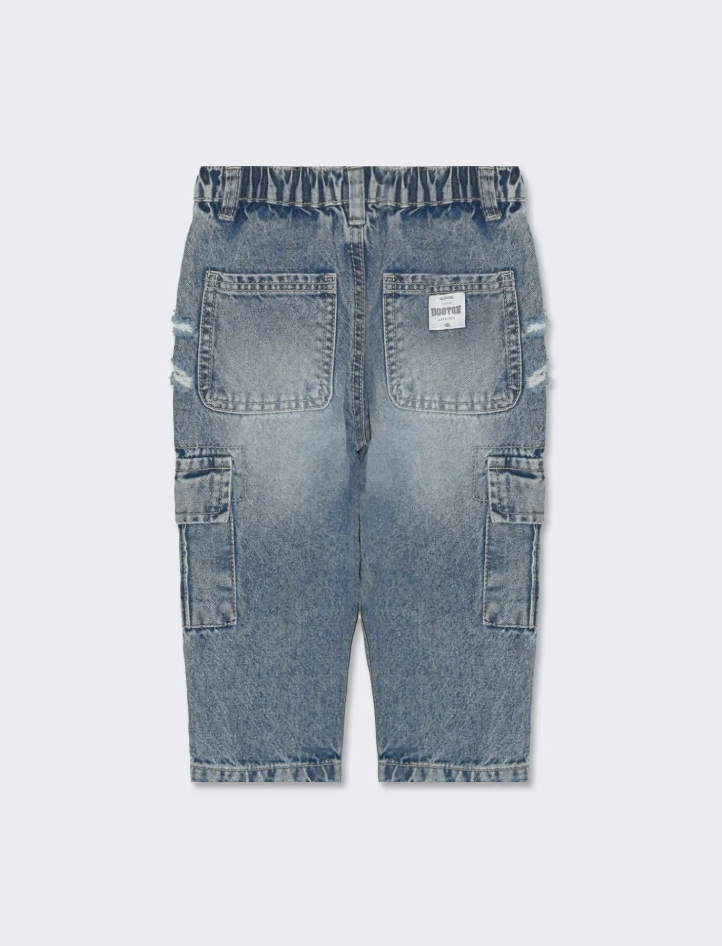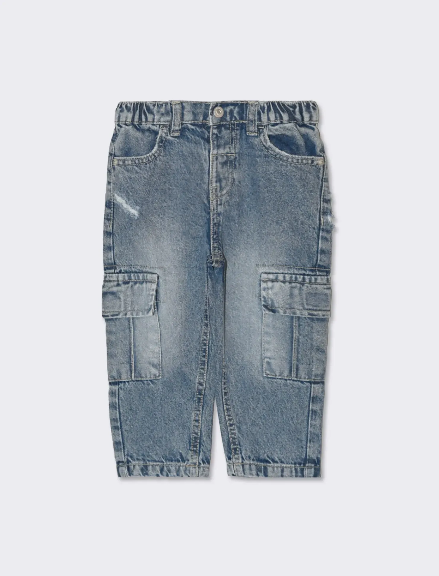 Jeans in denim con tasconi applicati, perfetti per i più piccoli. Realizzati con materiali di alta qualità, questi jeans sono comodi e resistenti, ideali per le giornate di gioco e divertimento. La chiusura con bottone a pressione rende facile vestire e svestire il tuo neonato. Il prodotto è di colore Denim