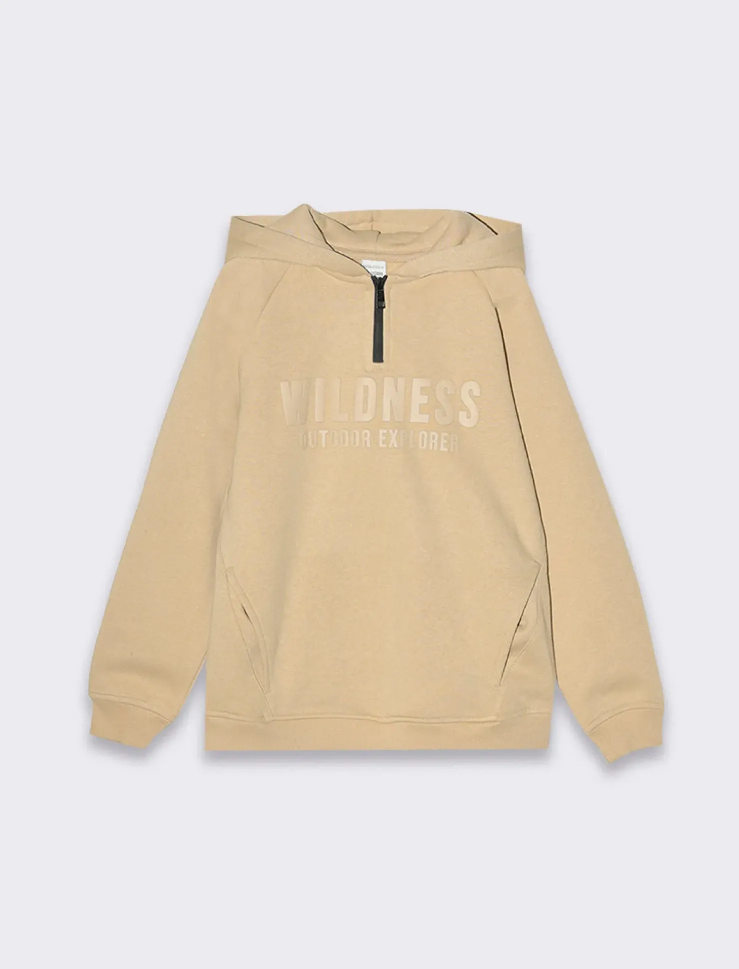 FELPA IN MISTO COTONE CON CAPPUCCIO E APERTURA CON ZIP FRONTALE. TAGLI E STAMPA FRONTALE PER UN LOOK GIOVANILE E IDEALE PER TUTTI I GIORNI. Il prodotto è di colore Beige