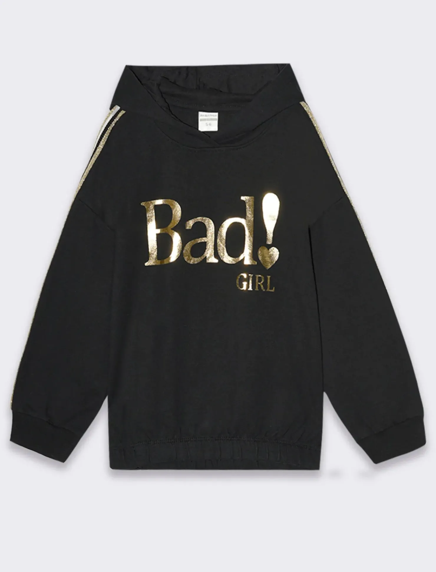 Felpa con cappuccio in cotone elastico per bambina, perfetta per un look comodo e alla moda. Le bande lurex sulle maniche aggiungono un tocco di brillantezza, mentre la stampa oro dona un tocco di eleganza. L’elastico al fondo assicura un comfort extra, ideale per le giornate di gioco e divertimento. Il prodotto è di colore Nero