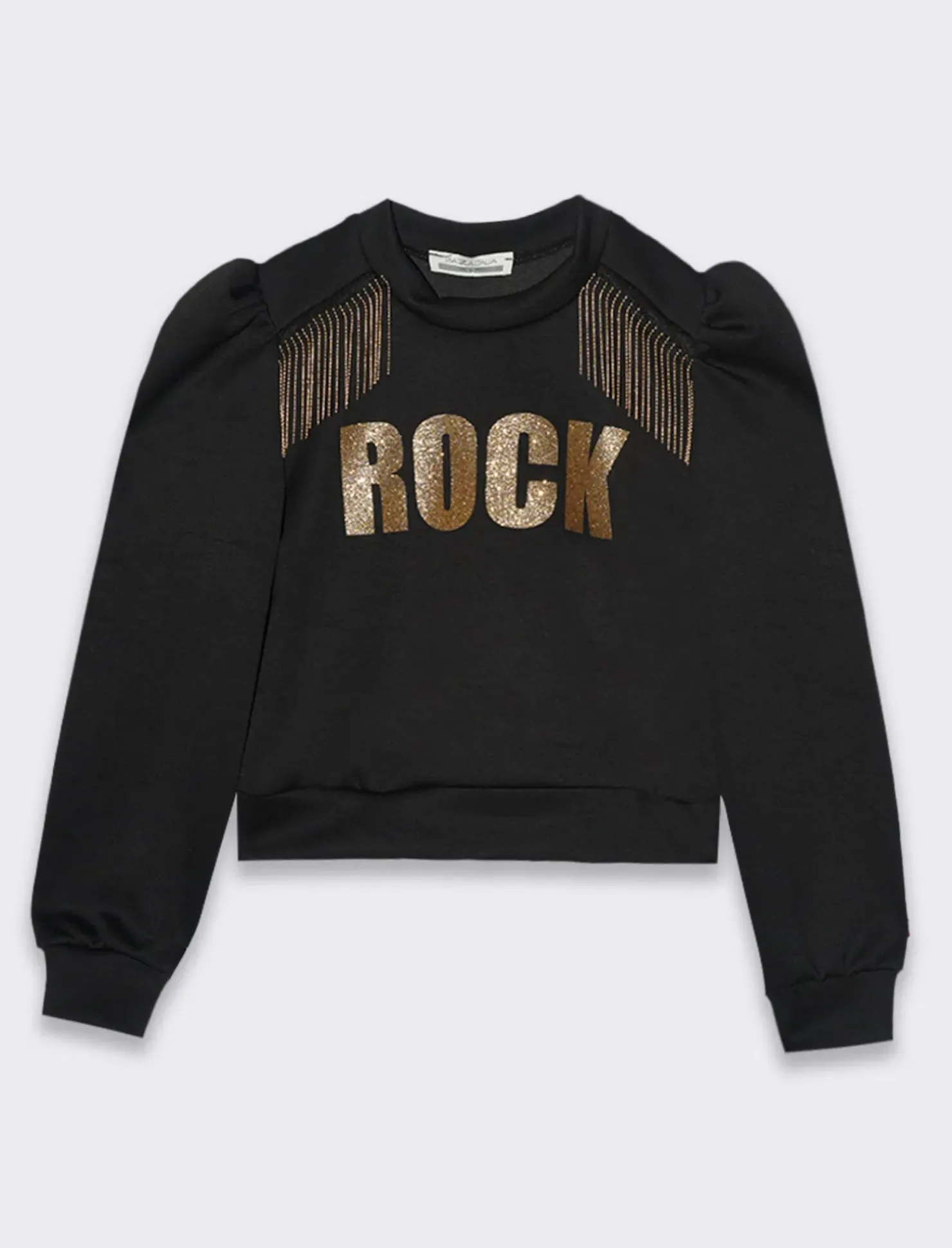 Felpa girocollo a manica lunga che unisce comfort e stile in un unico capo. La stampa glitterata sulla parte anteriore aggiunge un tocco di brillantezza e vivacità, catturando la luce e l’attenzione. L’applicazione di frangia metallica lungo le maniche o sul fondo della felpa introduce un elemento di movimento e originalità, rendendo il design ancora più accattivante. Questa felpa è perfetta per chi ama distinguersi con un look casual ma ricercato, ideale da abbinare a jeans o leggings per un outfit che non passa inosservato. Puoi completare il look con accessori metallici e scarpe alla moda per un risultato davvero unico e trendy. Il prodotto è di colore Nero